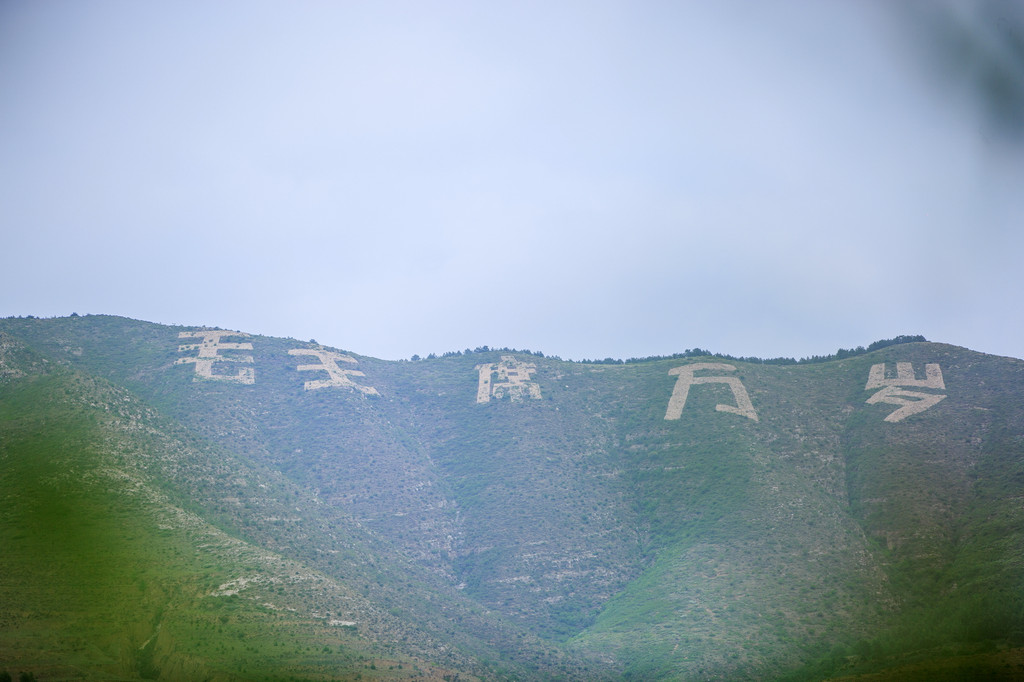 由浑源县沙圪坨村向北行驶不远,望见山顶处有“毛主席万岁”五个大字时,就接近荞麦川了。山上的字是用岩石砌成,每个有4.5亩大,字迹平整有力,所以哪怕在山下10余公里外仍清晰可见。