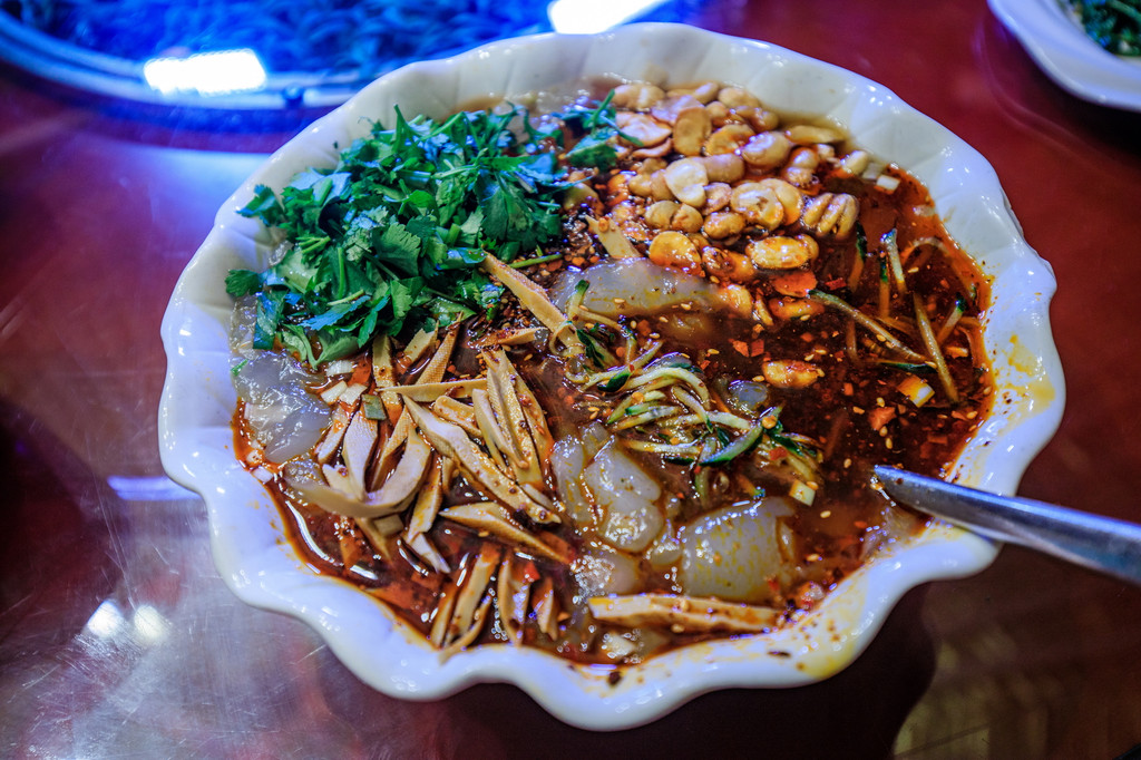浑源凉粉:这是山西浑源的特色美食。浑源凉粉又白又细又利口,以土豆淀粉为原料,再加入适量的明矾,搅成糊状,在火上滚熟,凉冷倒出即成,故又名粉砣,再加上莲花豆、豆腐干、辣椒油、葱蒜香菜等调料,莲花豆香酥可口,豆腐干嚼得过瘾,而辣椒油辣而不涩,可谓色香味俱佳,让人胃口大开。
