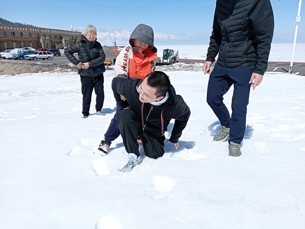 湖面也是覆盖着厚厚的冰雪层,只有在有限几块小码头处,有小小一块湖水露出来,清澈见底。湖面的冰雪延伸到远方和远处的雪山冰川相连,再往上是湛蓝的天空,天空偶尔飞过的雕隼,掠过那片片点缀的高大针叶林,看人看了不由得心胸开阔,壮哉我大美新疆!在中途一个停车点,沿着雪山栈道往上走了些,山上一些不怎么被太阳照到的地方积着厚厚的雪,我们踩到雪地上,一不留神,就踏空陷到膝盖了。也就小朋友体重占优,走在雪地上没什么影响,这让他得意得紧。