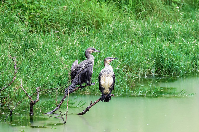 不过整个园区可不仅仅只有长颈鹿一种动物,我们还可以往前继续探索。紧接着我们来到的地方就是鱼鹰步道。一汪碧绿的湖水被茂密的竹林包围着,在这湖水之中就有着这样一群潜水冠军——鱼鹰。
