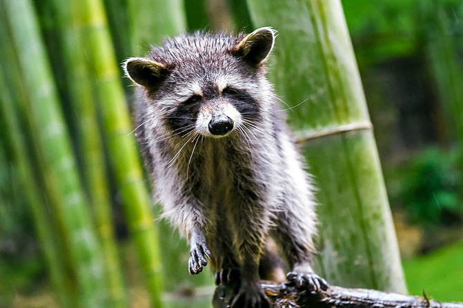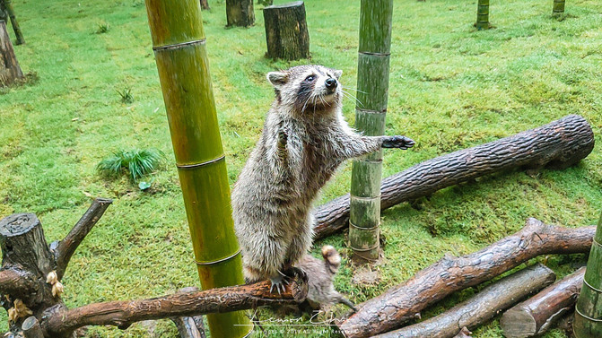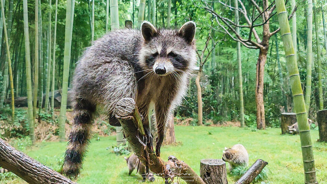 再往里面走,很多小动物因为下雨躲进了自己的小窝里面没有能够看到,只有一群可爱的小浣熊还在雨中热情营业。它们看到有游客过来,赶忙起来攀上枝丫,热情地迎接着我们。