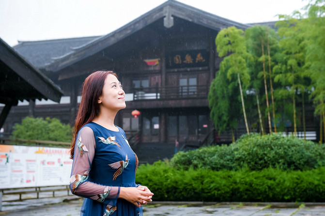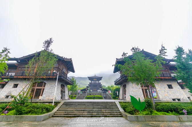 进入园中,放眼望去仿唐的古建筑中的正中,正是这大唐的贡茶院。这里三面环山,山却不高峻,一面开阔,却道云深不知处,细雨濛濛,云烟升腾而起,极具世外桃花源的意境。