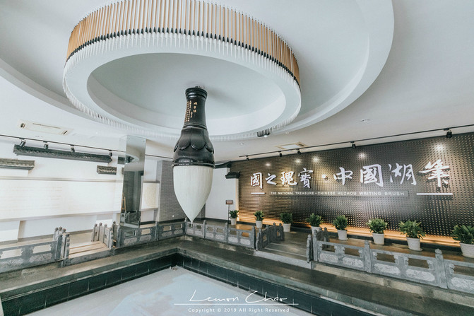 首先,我们参观了展现湖笔文化发展历史窗口的湖笔文化馆。进入序厅,你可以看到高悬于中央的一支巨型毛笔,总体长度达到了2.1米,代表着这个展馆是在2010年建造的。《湖州府志》当中记载,“善琏镇在府城东南七十里,一名善练,以市有四桥曰‘福善、保善、庆善、宜善’,联络市廛形如束练,故名。”因此在这支笔的四周建起了四座桥,分别为福善桥、保善桥、庆善桥、宜善桥。