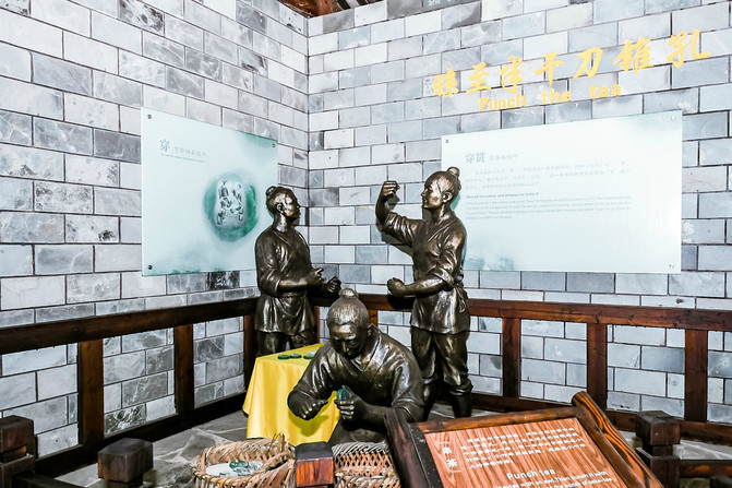 走出吉祥寺,便可以见到很多塑像,他们模仿的正是当年的采茶制茶的一些动作,活灵活现地再现当年采茶、制茶和最早的茶饼制作、到现代的紫笋茶制作。