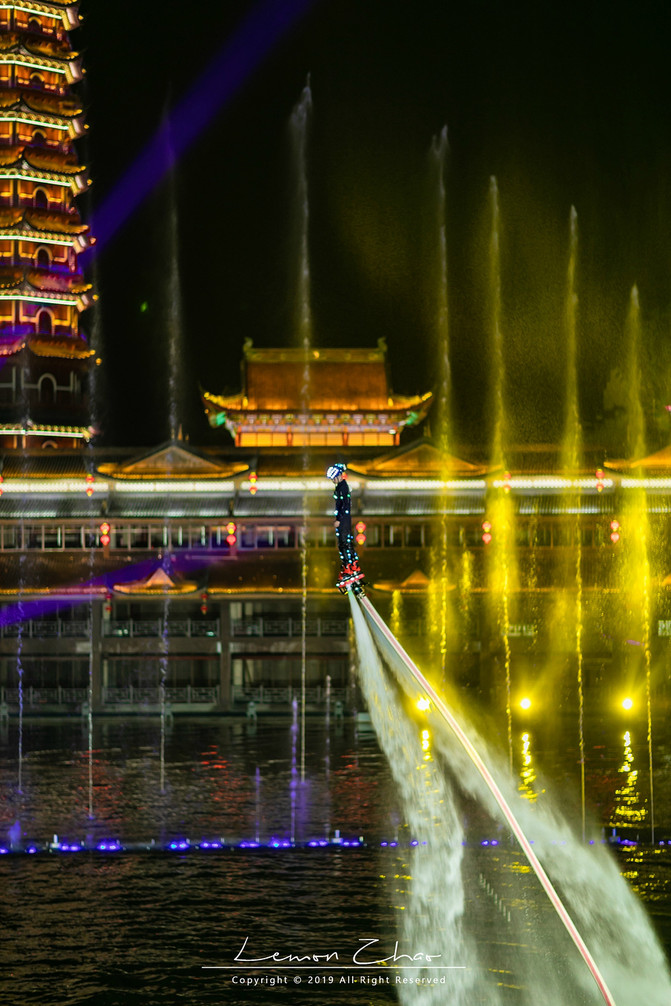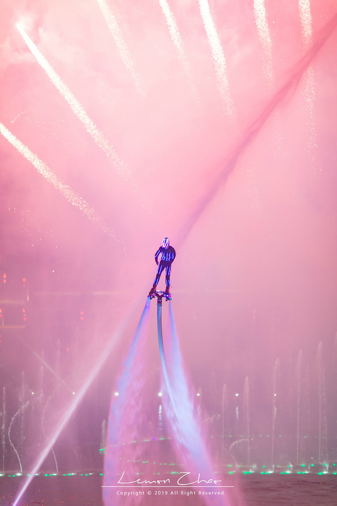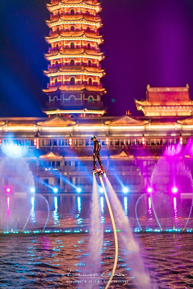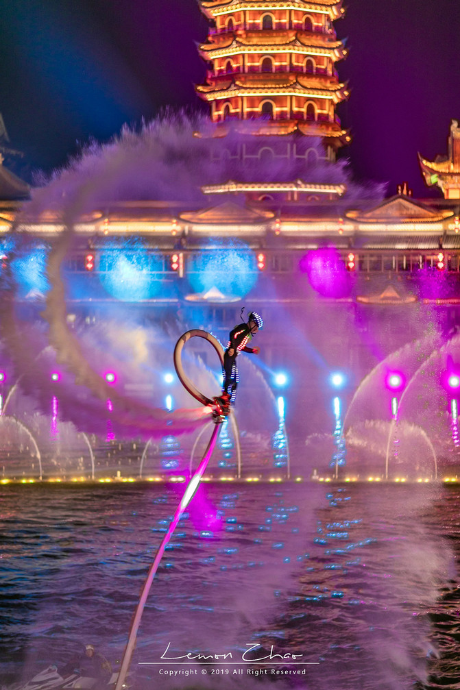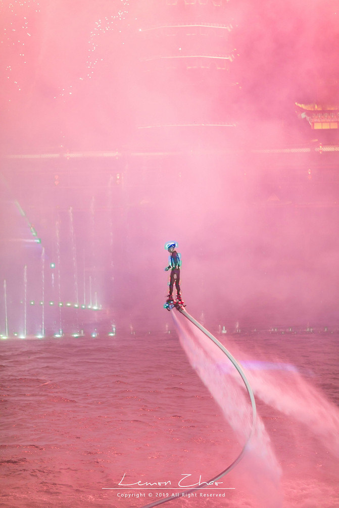晚上八点半一到,这湖面上瞬间热闹了起来。随着一曲《节日欢歌》的奏响,不知从哪儿冒出来的水上飞人就来了一个空中前滚翻,身着七彩闪光铠甲,在流光溢彩的光柱之中来回穿梭,随着音乐在舒缓悠扬与高昂激越中更替,舞秀的光色也变幻万千。