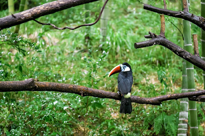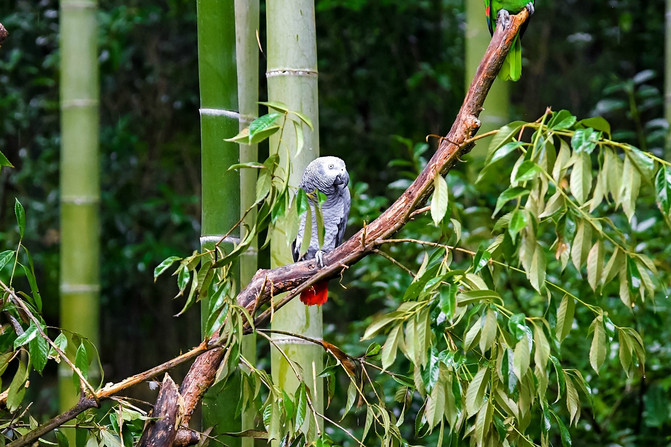 再往上走大约200米左右就可以到达萌宠乐园了,这里生活着很多可爱的小动物。最先看到的就是来自刚果的灰鹦鹉和它的鹦鹉朋友们了。都说灰鹦鹉是最会讲话的鹦鹉了,但是今天无论我们怎么挑逗都好像对我们爱搭不理的,顶多就哼哼了两句。可能是因为今天下雨的原因,它们慵懒地站在枝头,心情也不是那么开心吧。