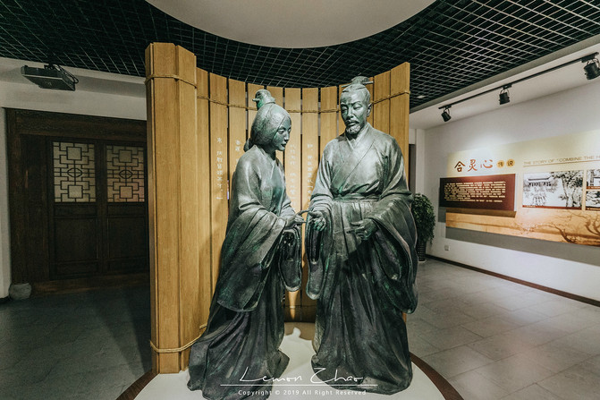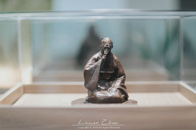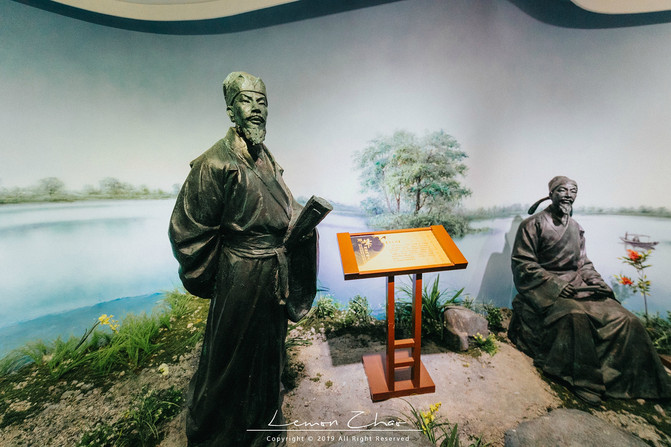 虽说是仿古建筑,但是这大唐贡茶院依旧是气势恢宏。正中的陆羽阁,循着木梯从上至下缓缓而上。最底层再现陆羽《茶经》的经典茶语;二层则以陆羽最喜欢的顾渚山景、紫笋茶园,将这美丽的景色用书法、绘画等形式收藏在了这里,无论你什么时候来,都能看到这四季之景,将最美好的记忆永存在心中。陆羽与茶结缘,文人墨客挥毫泼墨大加赞赏,最后这紫笋茶成为贡茶名扬天下;最高层是一处通透雅阁,正中央端坐着塑像正是陆羽,在这里敬拜陆羽不用香而用茶,这也是这里独有的习惯。