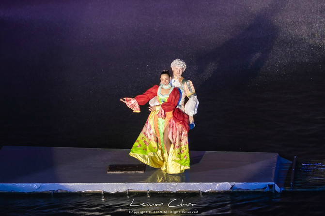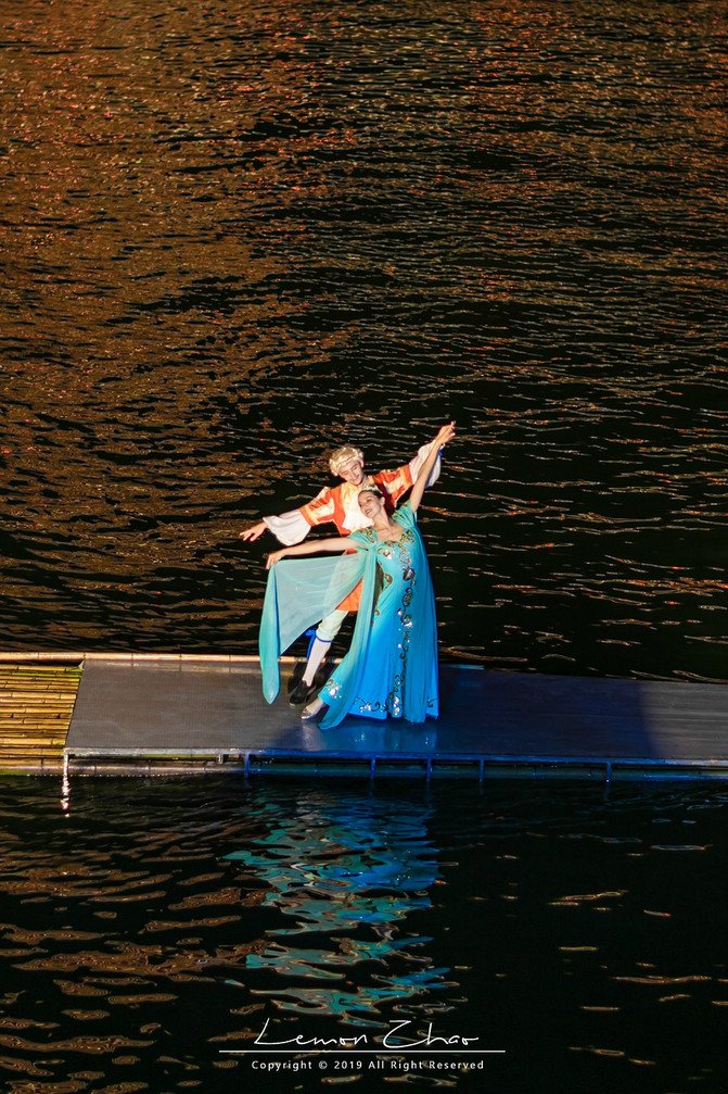 整个水舞秀的主题是“梦回吴越”,而且更是采取了中外融合的形式,因为这里的演员都是外国人。伴随着音乐的奏响,身着古装的男女演员乘坐着一叶竹筏缓缓地从水面而过,体态轻盈,似在水中翩翩起舞,伴随着古朴悠扬的音乐,幻化成了一幅山水诗卷。