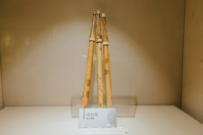 第二展厅则侧重展示的是毛笔的起源。据说毛笔在五六千年以前就已经出现了,商代甲骨文的图案、青铜器上的金文,都好似用毛笔所撰写的。