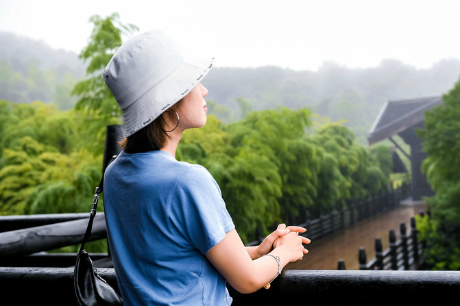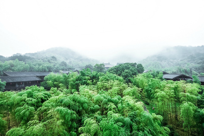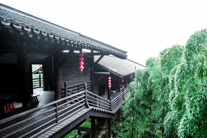 站在这儿凭栏四望,远处层峦叠嶂, 层层掩映间百年古寺若隐若现。烟雨朦胧,万竿修竹,一派苍翠,茶树茶垄,掩映其间。站在最高层,心胸都瞬间开阔了不少,深吸一口气,能够感受到这浓浓的紫笋茶的清香,在这群山环抱之中,整个贡茶院宛若遗世而独立,成为这世外的桃花源。