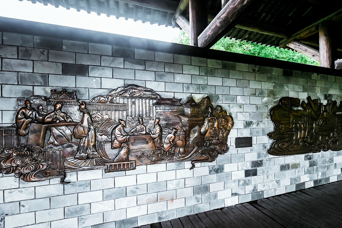 走下陆羽阁,寻道往旁边的亭台楼榭走去,这是怎样的一种感觉,循着当时皇家才能走过的道路循循前行,一路上的长廊中悬挂着的壁画讲述着在大唐贡茶院发生的故事。一幅幅栩栩如生的壁画,仿佛穿过这长廊,就能梦回大唐,感受陆羽带着工人们在这里发生的一切,都那么的真实。