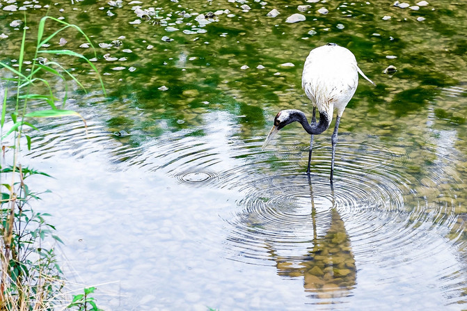 按照原路返回在长颈鹿餐厅的地方就可以换成另外一条道路出园了,在这里还可以看到有一个小型的湿地,里面有一些丹顶鹤正在觅食。能在这儿见到丹顶鹤,而且完全就是散养的,真的是太难得了。