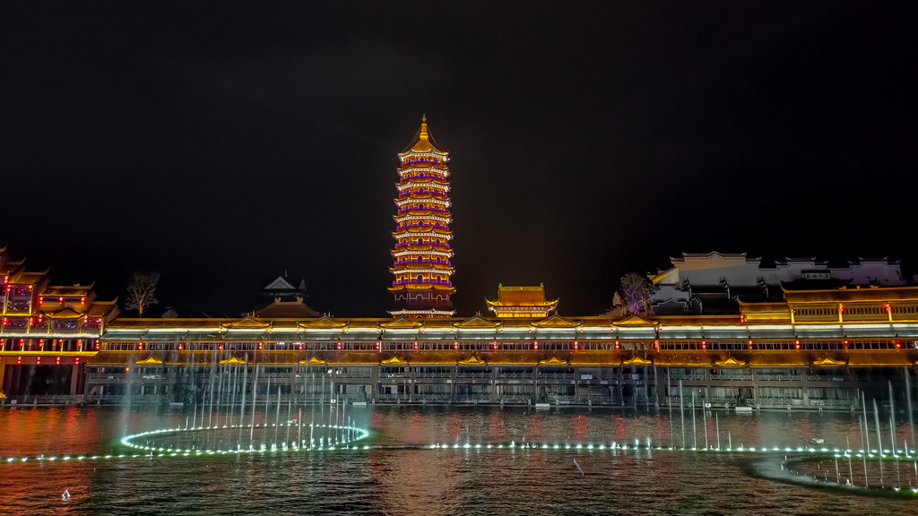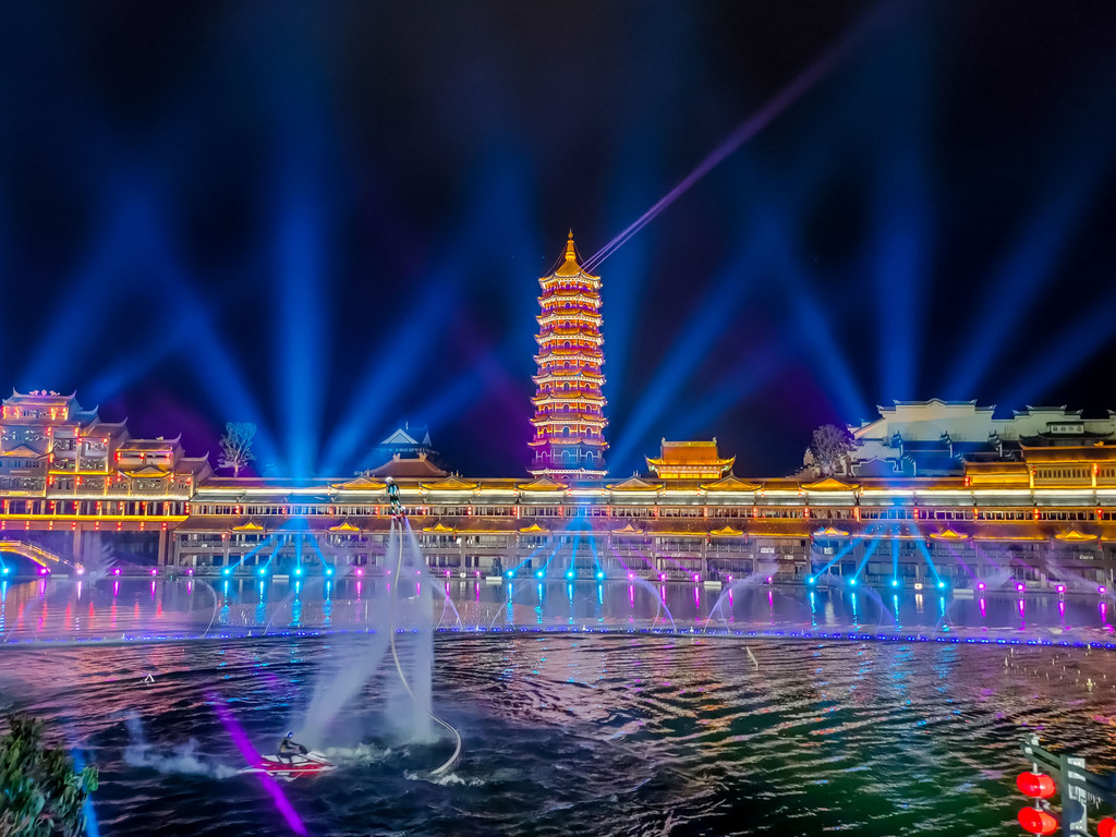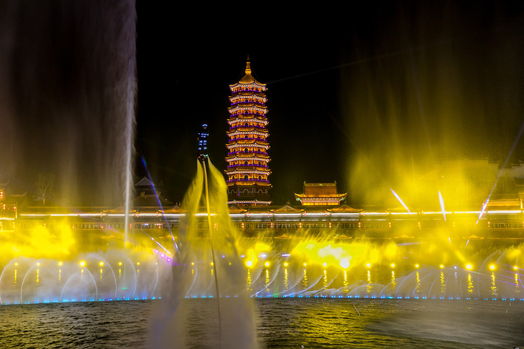 古镇建筑群在水光交融中,愈发金碧辉煌、如梦似幻,五彩水柱翩翩起舞,光柱穿越水柱在顶端散开,瞬间变幻成五彩缤纷的珠子洒下水面。