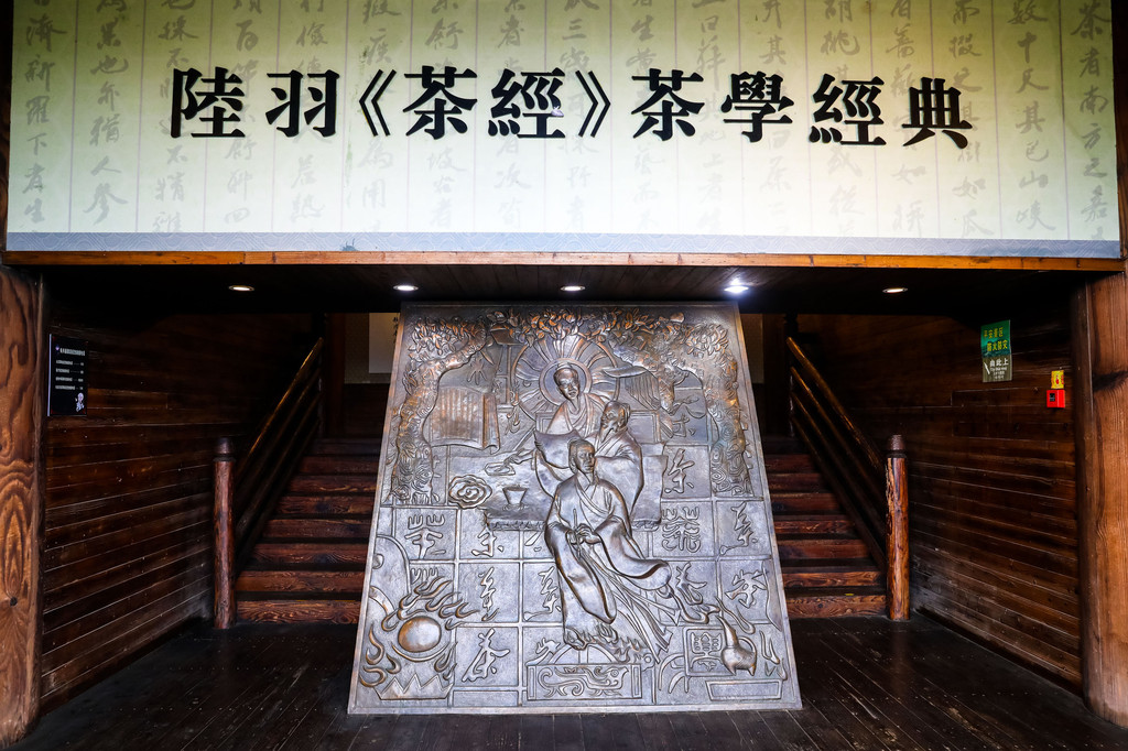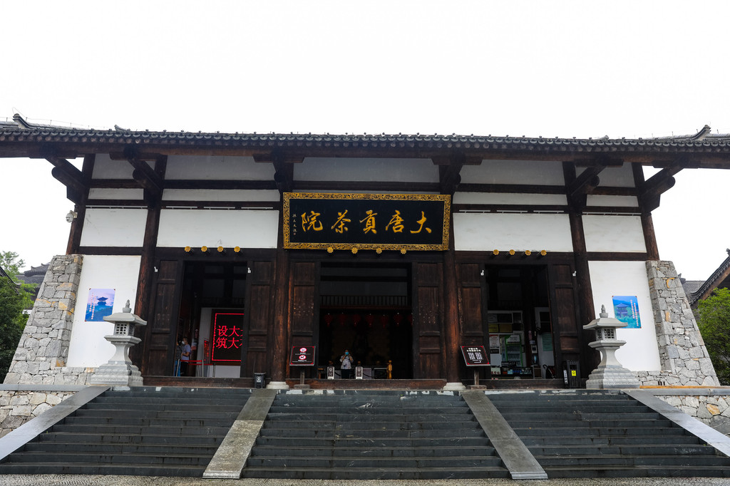 进入园中,一眼就可看到一座全木建造的贡茶院。茶院山势虽不高峻,但三面环绕,高低错落,极具世外桃花源的意境。新建的大唐贡茶院气势恢宏,沿着木梯登上陆羽阁。