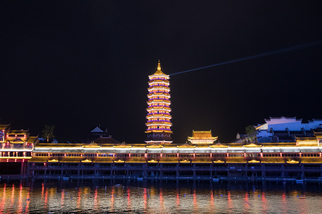 随着夜幕的降临,到处灯火阑珊,这时的小镇子也是最为静谧的,徜徉在夜色下的古镇内也是非常享受的,走在百间楼岸边的石板路上,一串串大红灯笼及对岸的人家灯火将整个古镇映衬的非常美丽。