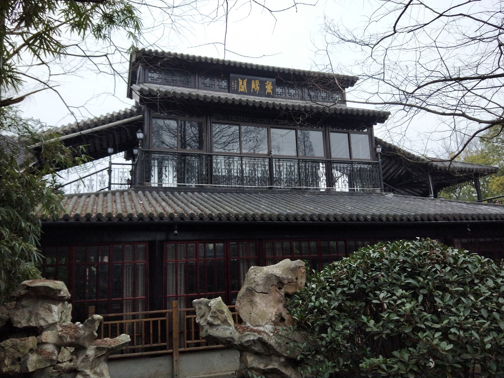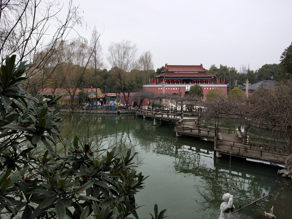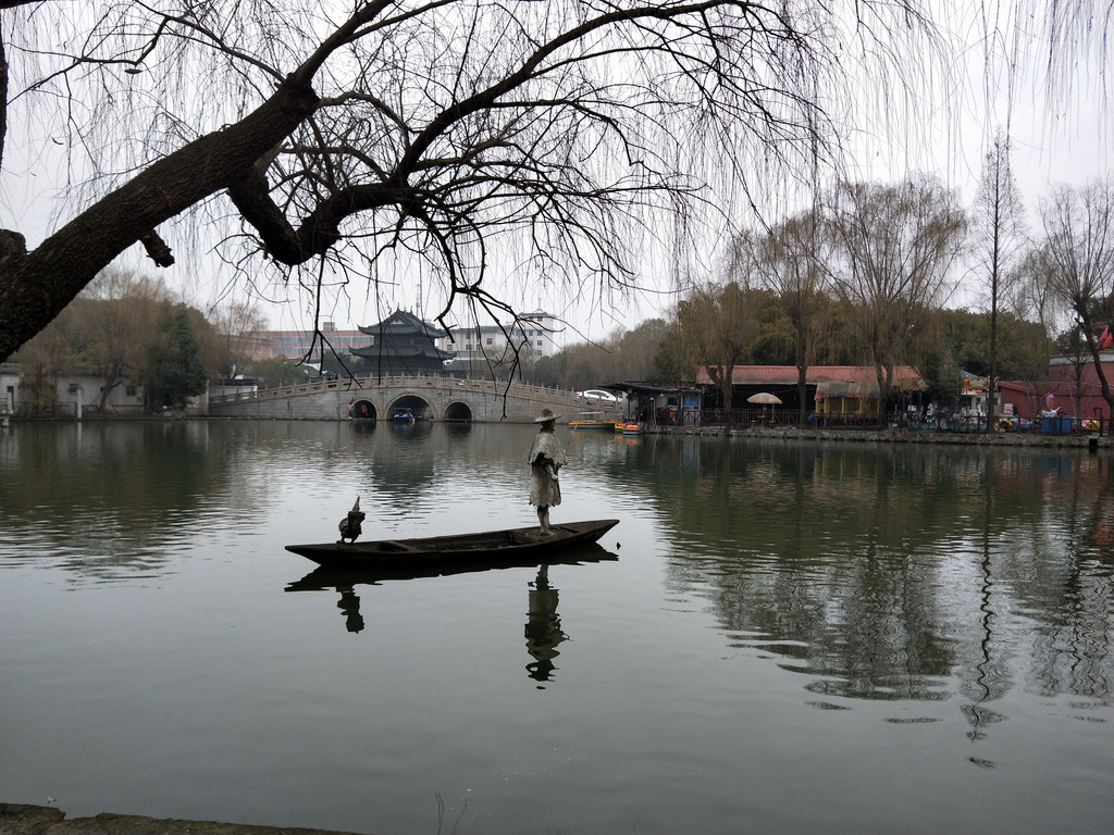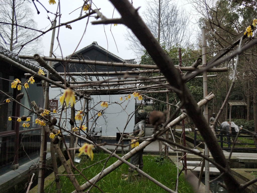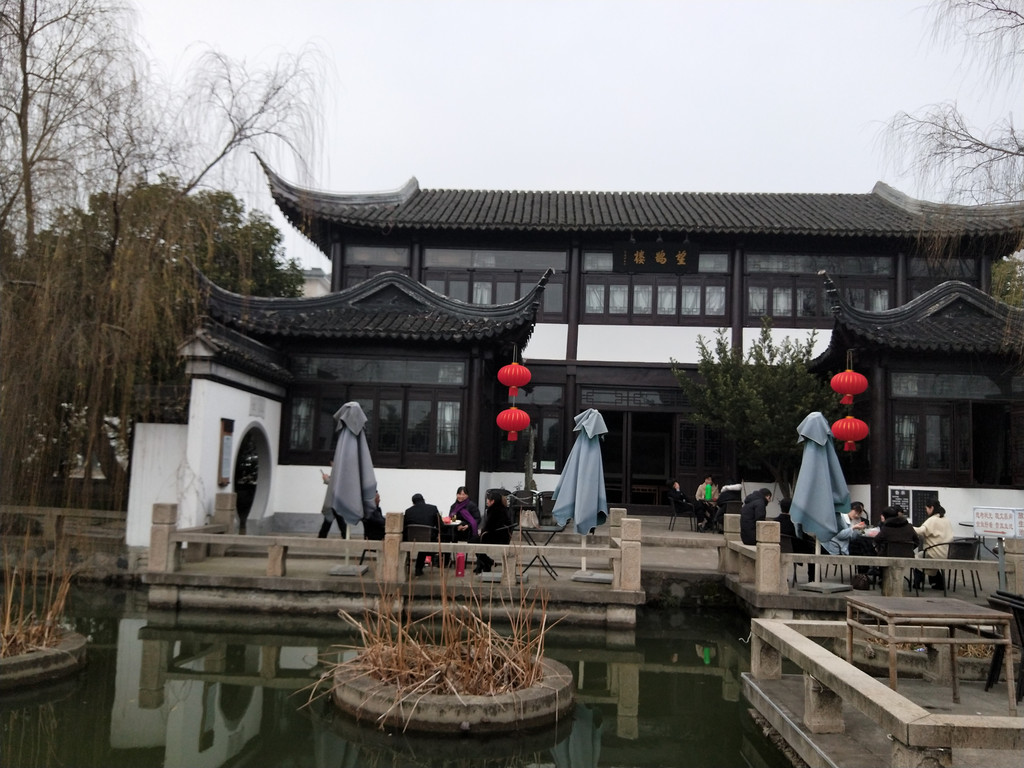 往前走有圆形拱门,走进去原来是望鹊楼,门前临湖,是室外的茶座。虽然天气还不算暖,但还是有游客在这里喝茶聊天。今日无风,穿着厚实的大衣或棉衣,倒也不觉得冷。