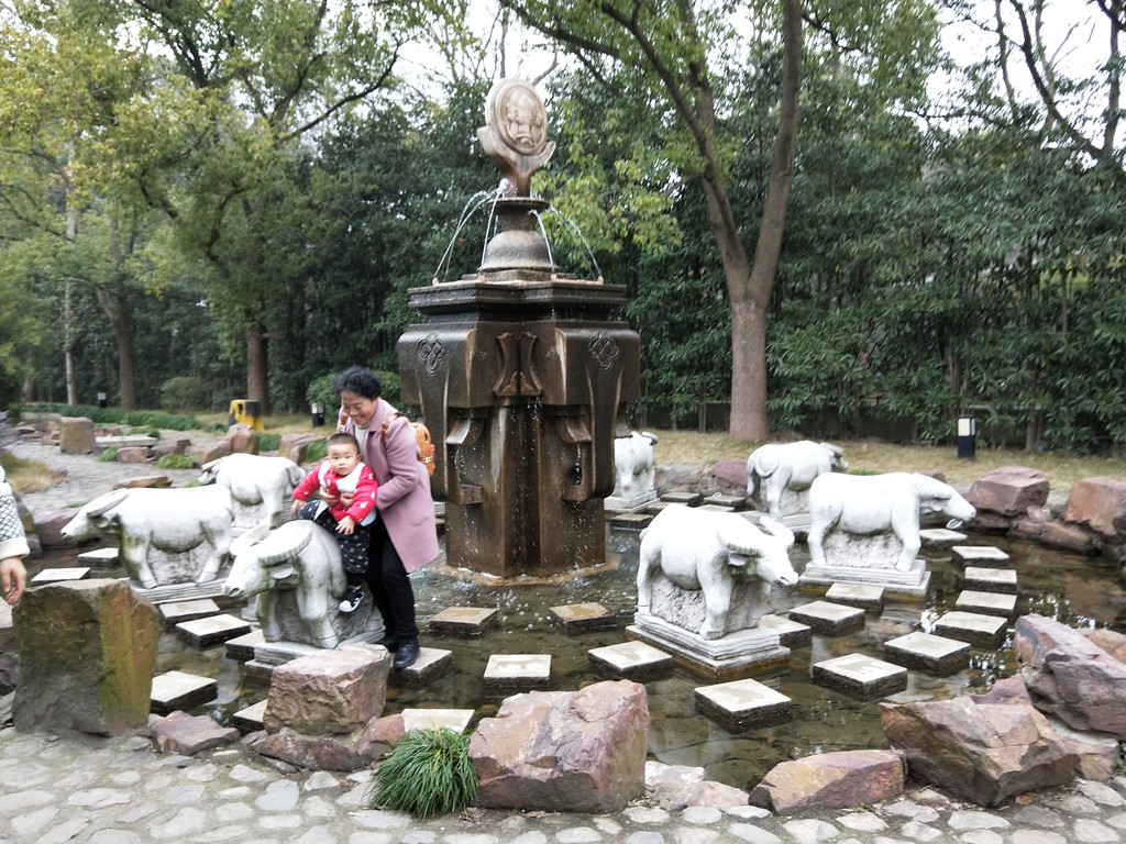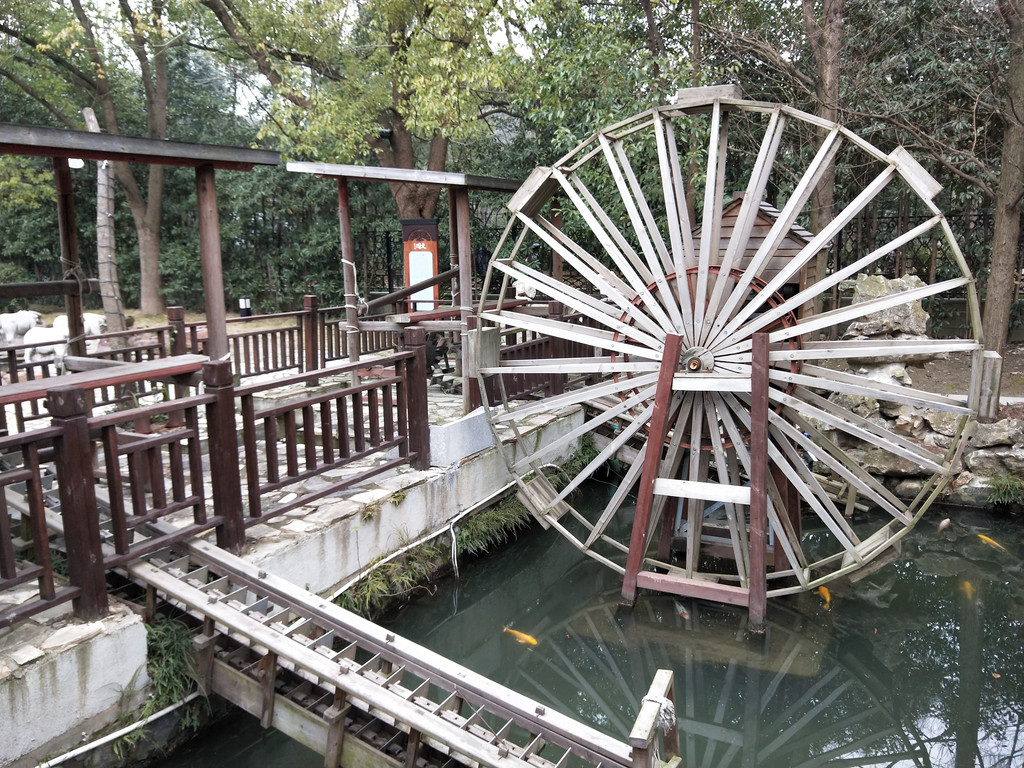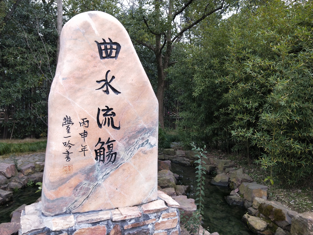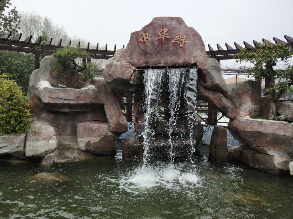 曲水流觞到了下游,有一处小小的人工瀑布,上书“中华鲟”三个字。我有点纳闷,中华鲟这种硬骨鱼纲鲟科的鱼类,主要分布于长江干流金沙江以下至入海口,没听说南浔盛产中华鲟啊?难道因为这种鱼类有一个“鲟”字,与南浔的“浔”字同音的缘故?