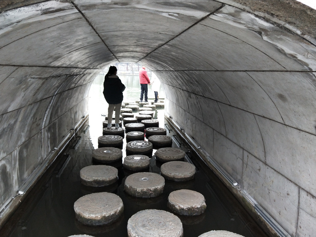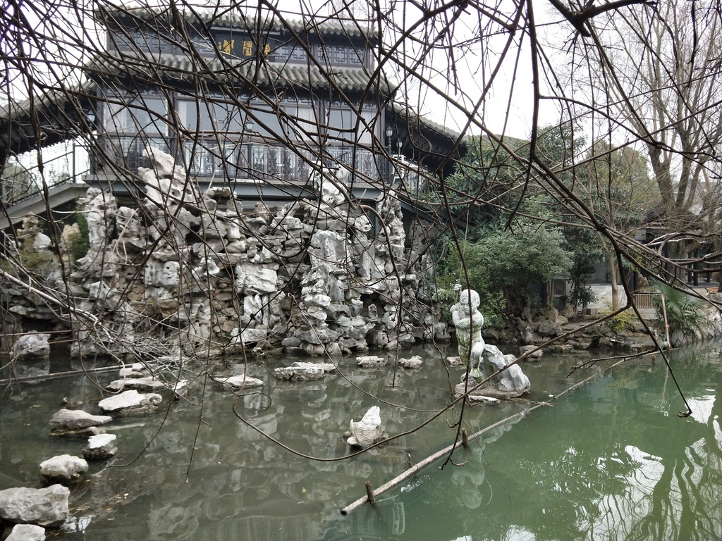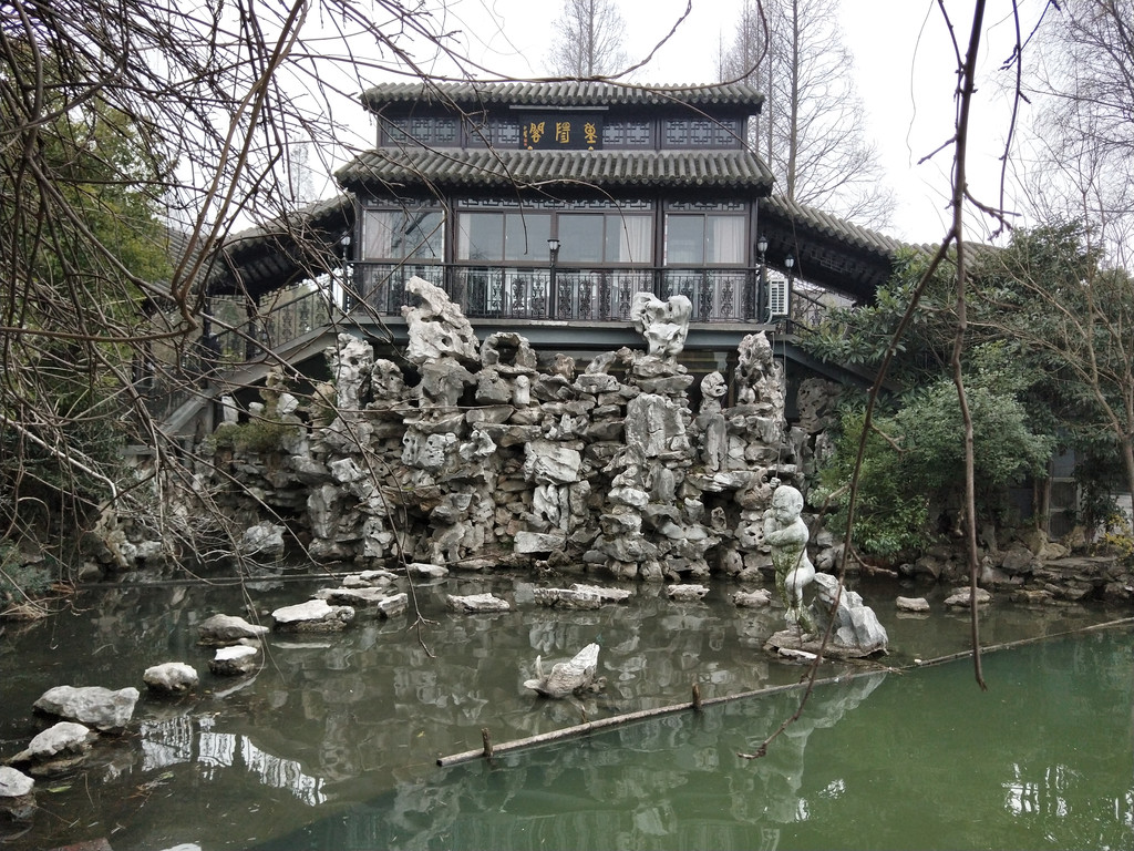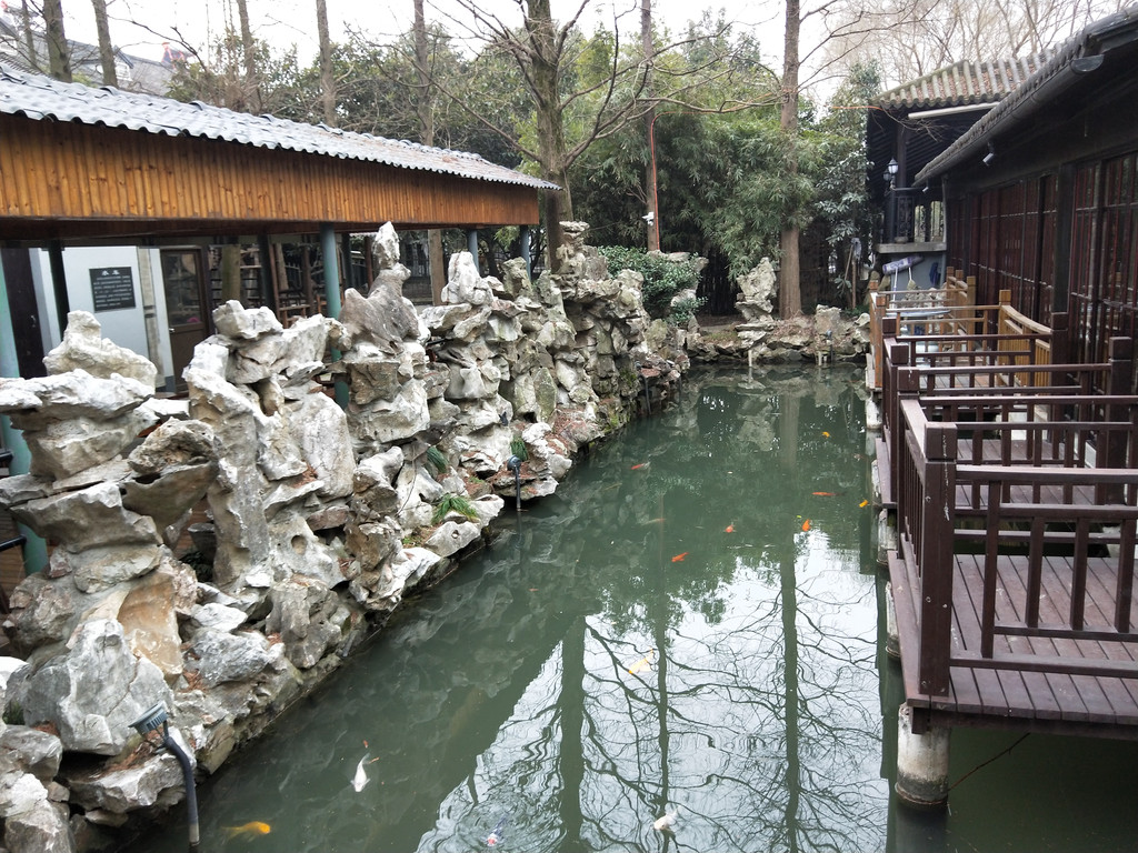 曲水流觞到了下游,有一处小小的人工瀑布,上书“中华鲟”三个字。我有点纳闷,中华鲟这种硬骨鱼纲鲟科的鱼类,主要分布于长江干流金沙江以下至入海口,没听说南浔盛产中华鲟啊?难道因为这种鱼类有一个“鲟”字,与南浔的“浔”字同音的缘故?