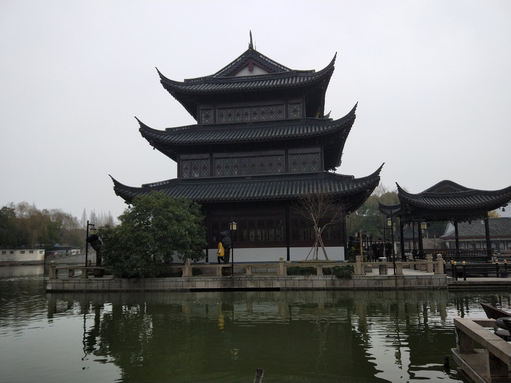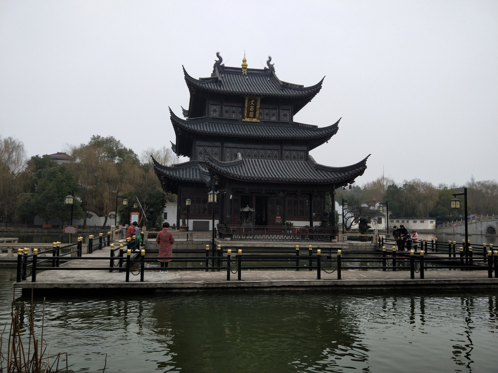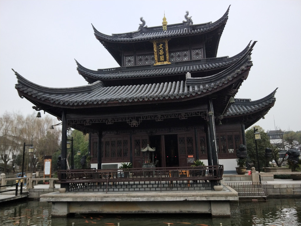 过桥就是文昌阁,这座阁始建于明朝嘉靖年间,由南浔籍的礼部尚书董份所建,是历来南浔经济发达和文化昌盛的标志,是南浔八景之一。清乾隆三年毁于大火,乾隆三十四年南浔镇官陈名荣联络商界及百姓捐款重建。阁高三层,四角飞檐,立于湖侧,显得高大雄伟。