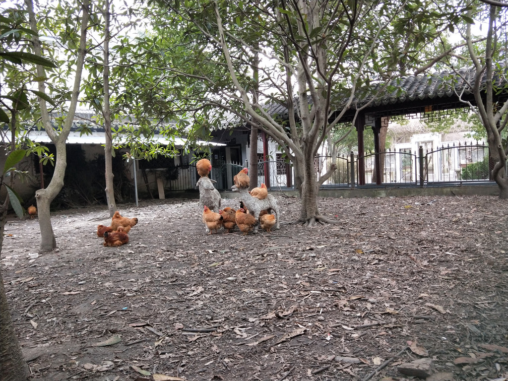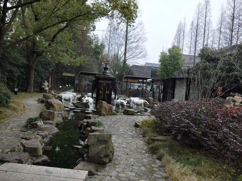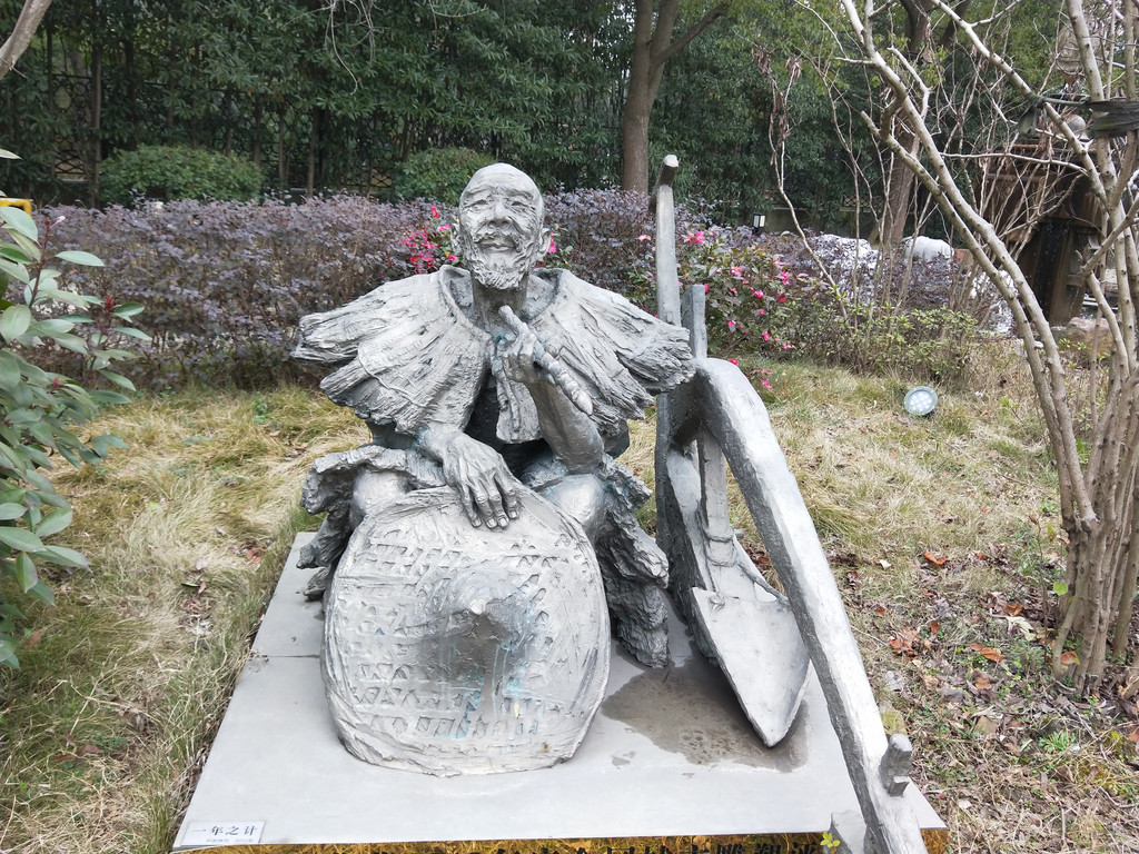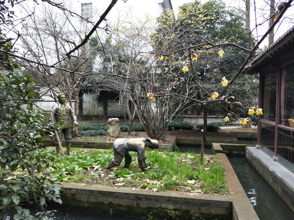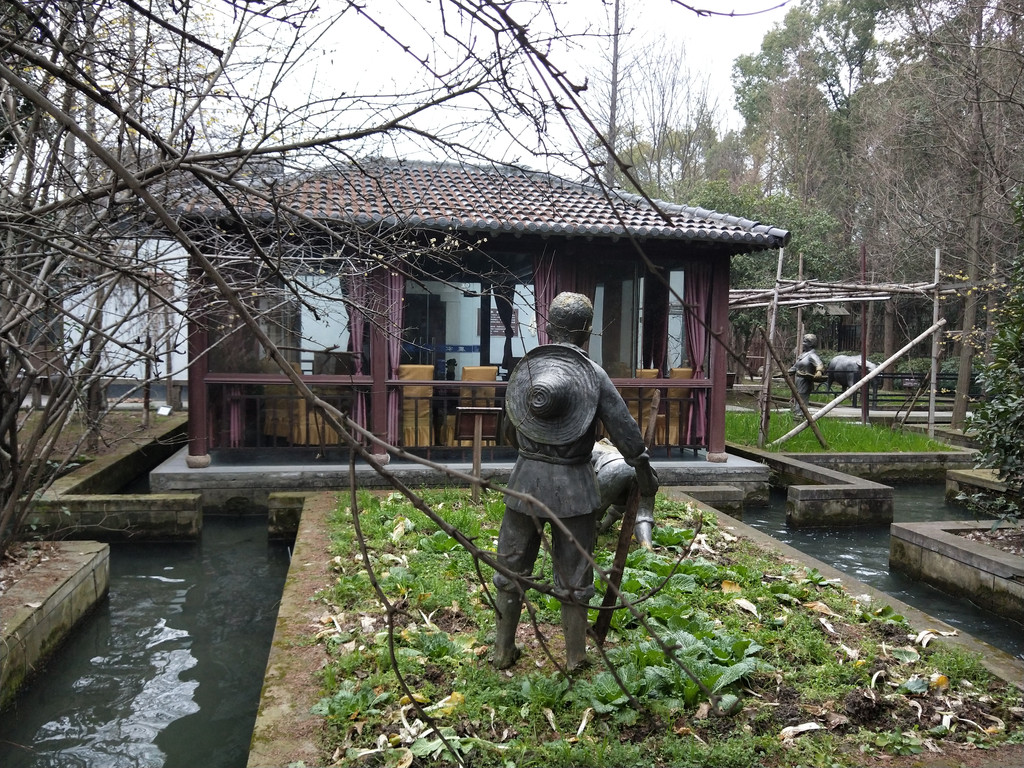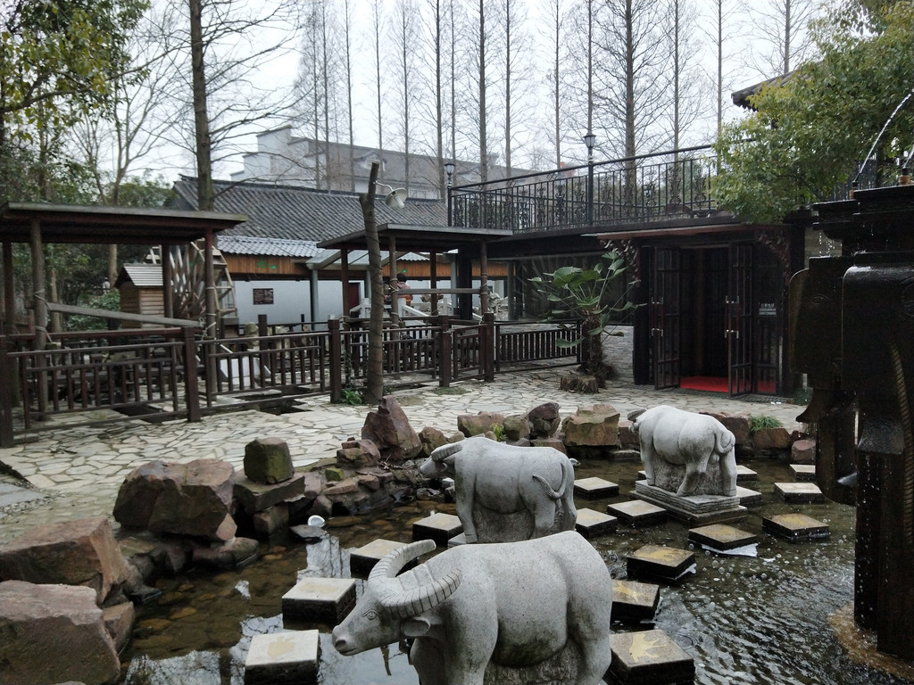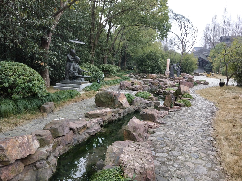 走到农家小院,有一组曲水流觞的雕塑。 “曲水流觞”是古代一种比较风雅的民间习俗,人们在举行仪式后,分坐在水渠两旁,酒杯顺流而下,停在谁的面前就由谁取饮,文人雅士们不但饮酒,还得赋诗作词,最著名的当属王羲之在绍兴兰亭的友人雅集了。