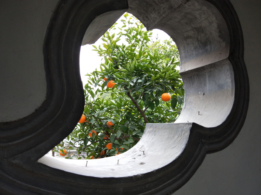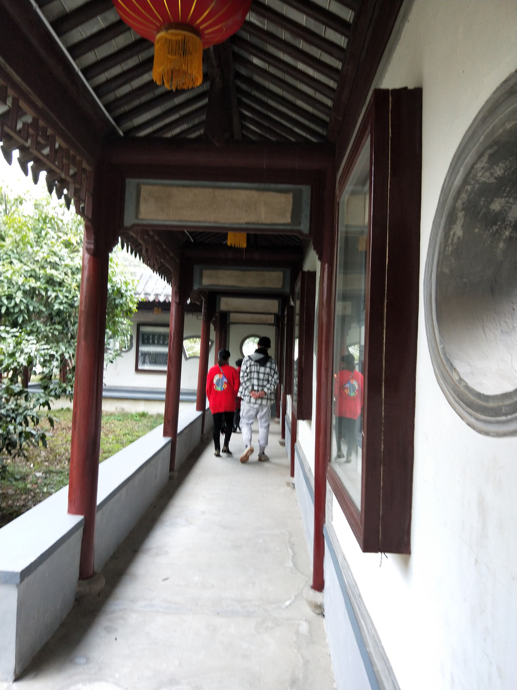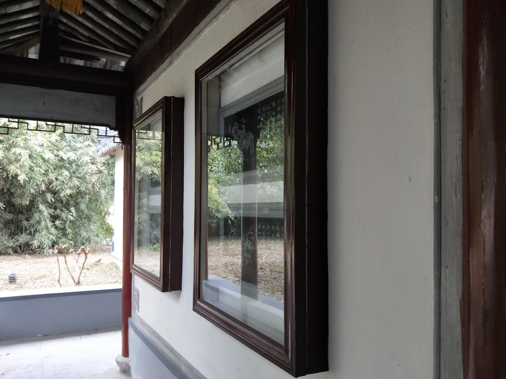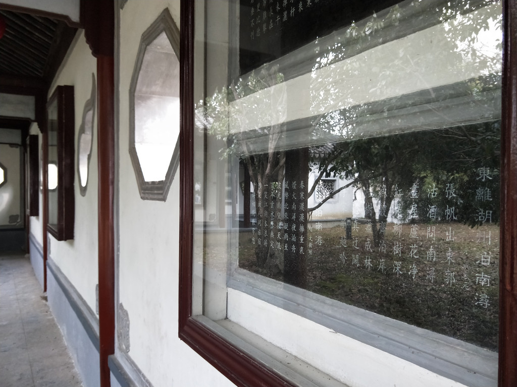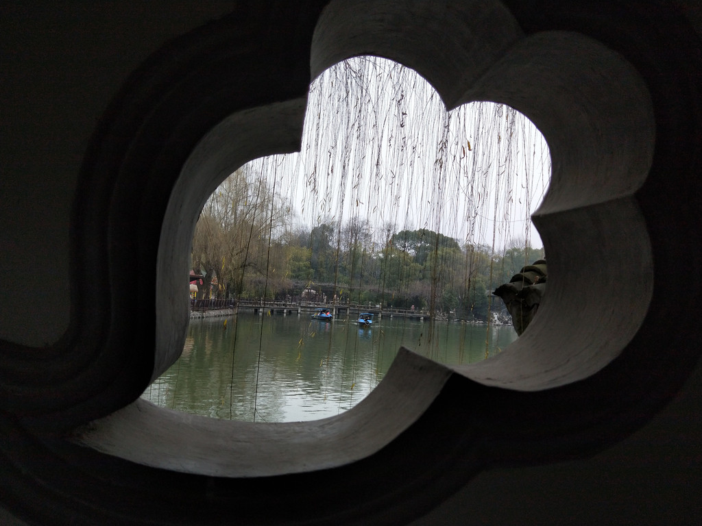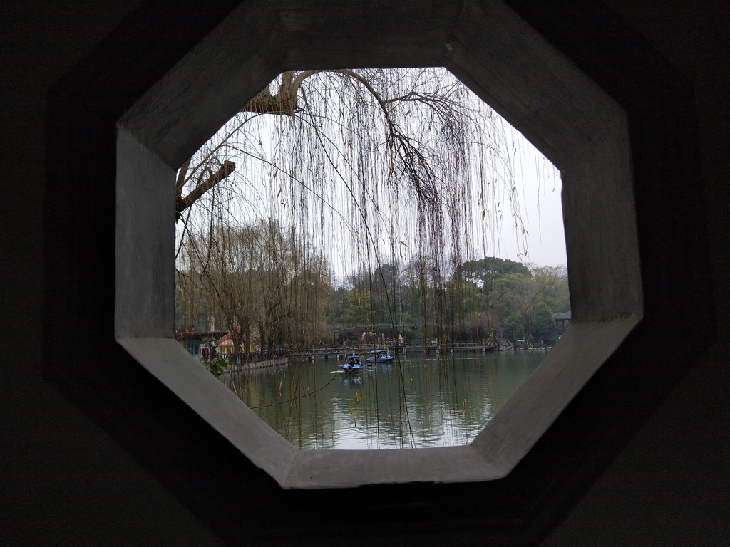 过桥上岸,又是一段长廊。长廊靠湖的一侧有花窗,不管从哪一扇看出去,都是一幅天然的山水画。