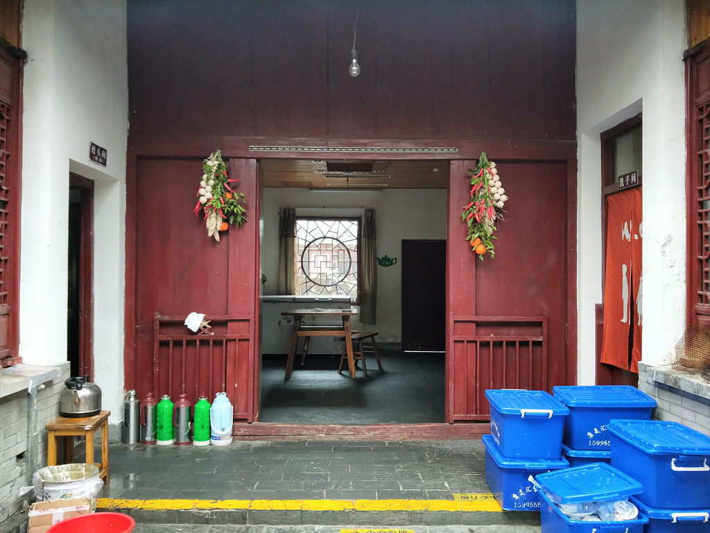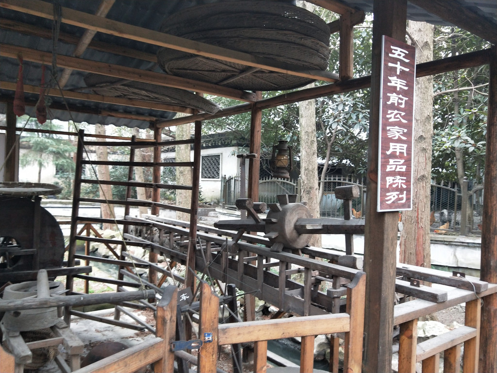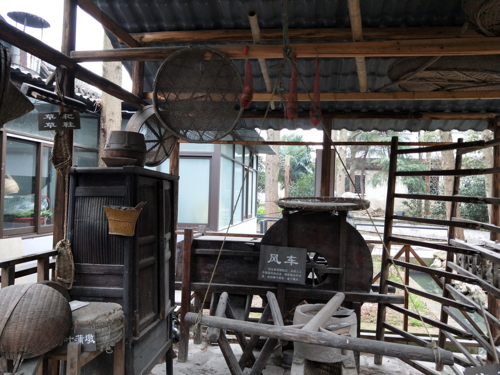 这座农家屋是二十世纪五六十年代江南农村的住宅,三间二龙梢建筑,中间是正屋,用来吃饭和招待客人。东房是卧室,西面则是蚕室,三龙梢中的西厢房是厨房,东厢房是磨房和放置农用生产工具的杂物间。屋内置放着一些实物,屋外还有风车。看样子,这户人家的条件应该不错,南浔的富庶可见一斑。