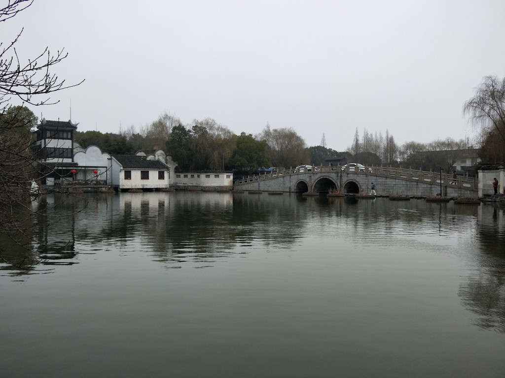 从文昌阁前的平台上,可以看到湖上的现代化拱桥,三孔中间一个最大,两侧则要小一些,桥孔对称,桥形优美。