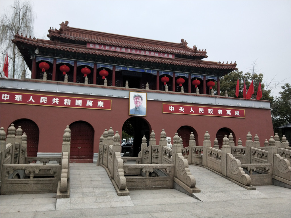 往前走过去就是小天安门,门上悬挂的毛主席画像是开国大典北京天安门毛主席画像的原作者周令钊、陈若菊教授于2004年专为文园小天安门绘制的,这个景观仿的是开国大典的原貌。