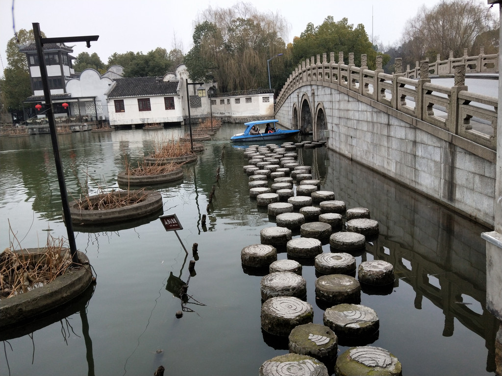 往前走到刚才隔湖看到的桥侧,我们没有上桥,因为桥侧有几排石墩子可以穿越桥洞,从这里走更加别有趣味。一旁还有残荷枯枝,到夏天这里会更美。从这个角度看文昌阁,显得更加雄伟。