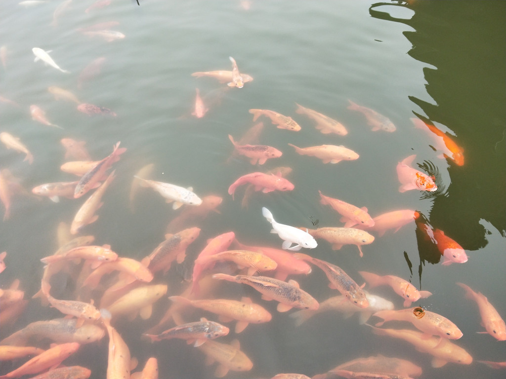 池塘里锦鲤悠游自在,塘畔还有假山堆砌。这些假山沿着塘边一溜儿排开,虽然不能攀爬,但也颇有趣味。