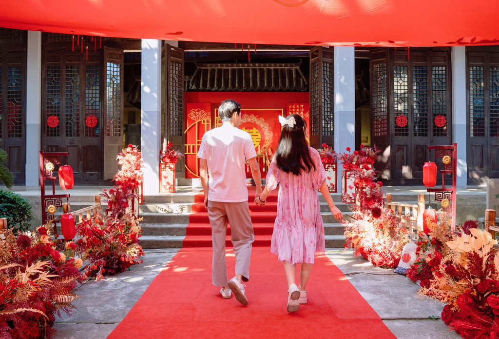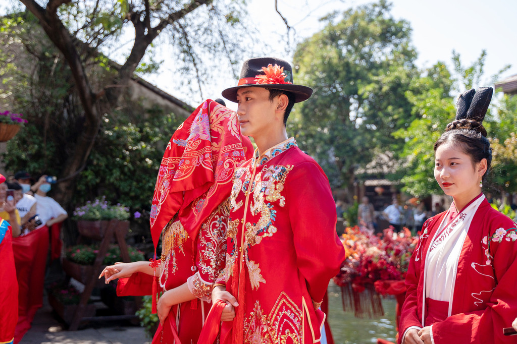 据说,在从前的南浔古镇,水乡婚礼十分壮观,南浔新娘子出嫁,都是要坐着摇撸船慢慢摇到新郎家去的,迎亲的船队一到,锣鼓一响,鞭炮一放,贴着大红喜联的婚嫁船,就摆到了新娘子家门口,打头的数艘摇撸船上都是新娘的嫁妆,一堆堆的红木大箱,一卷卷的绫罗绸缎,这些满载着嫁妆的喜船在整个迎亲队伍中驶在最前面,徐俆前往新郎家。