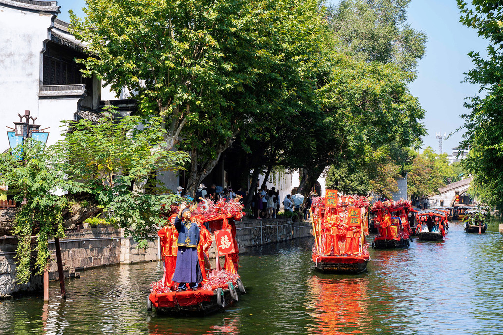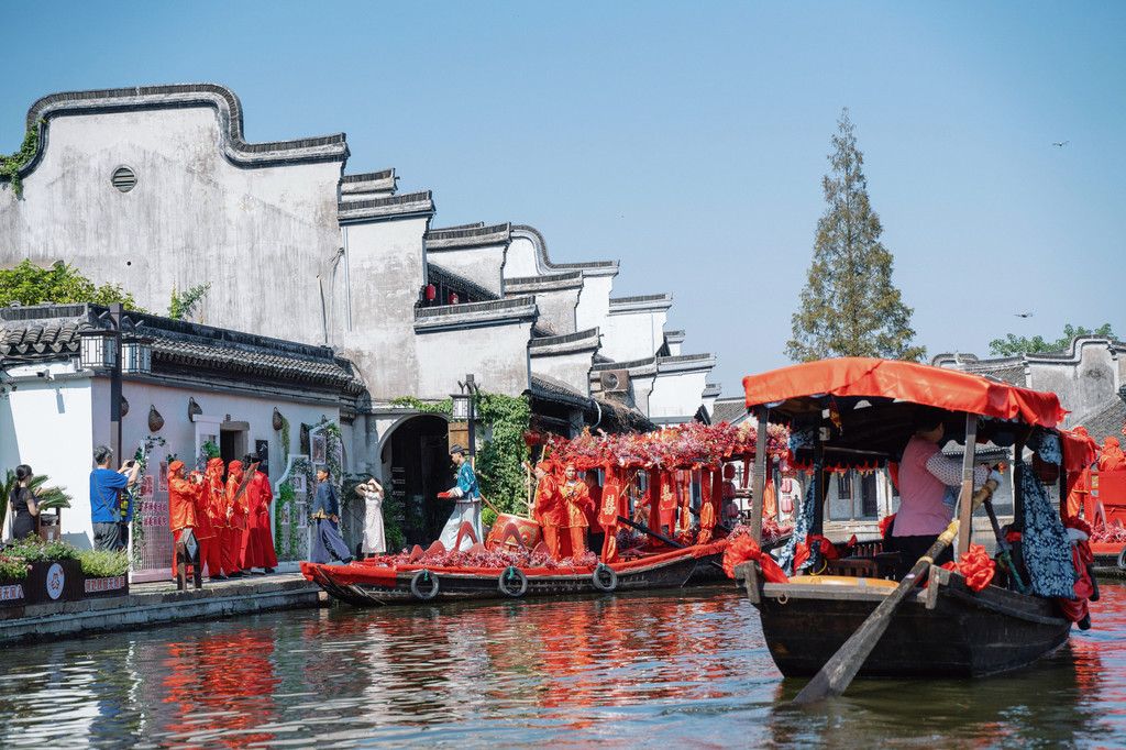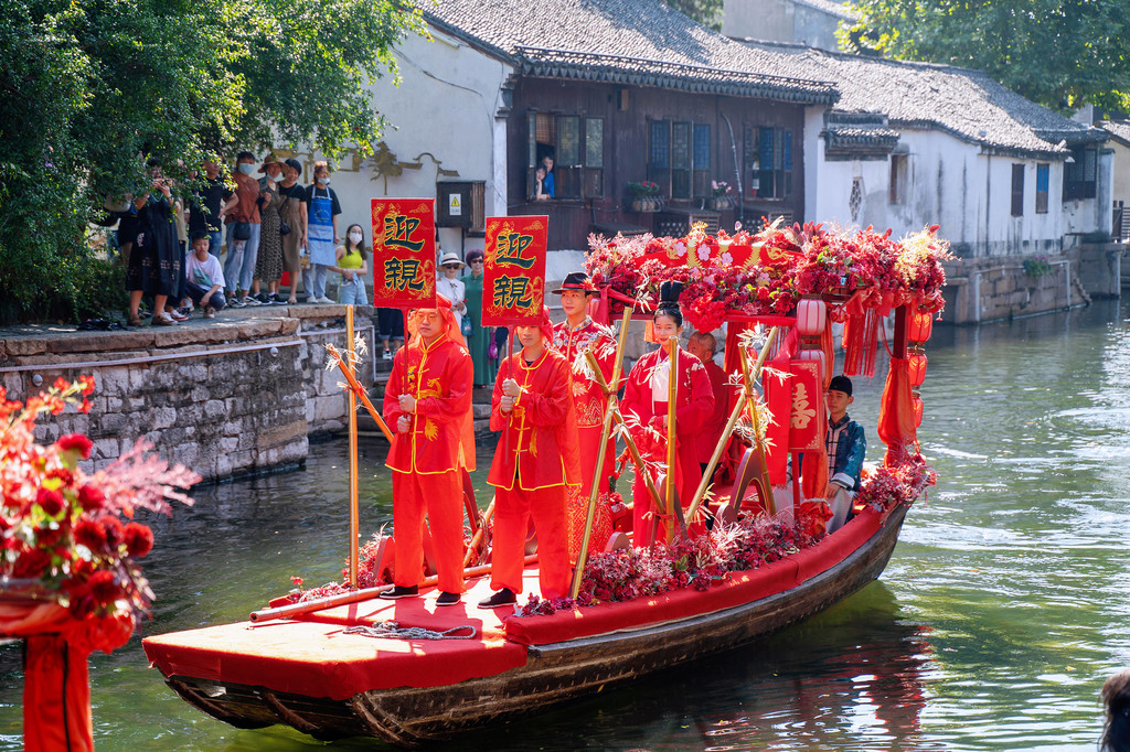 队伍的送亲船、迎亲船、乐队船、嫁妆船等应有尽有,一艘艘精心装置的小红船行驶在河道上,在嫁妆船之后,主婚人站在船头,英姿飒爽,风流尽显,赢得水乡两岸游客观众阵阵喝彩,拍照发圈。