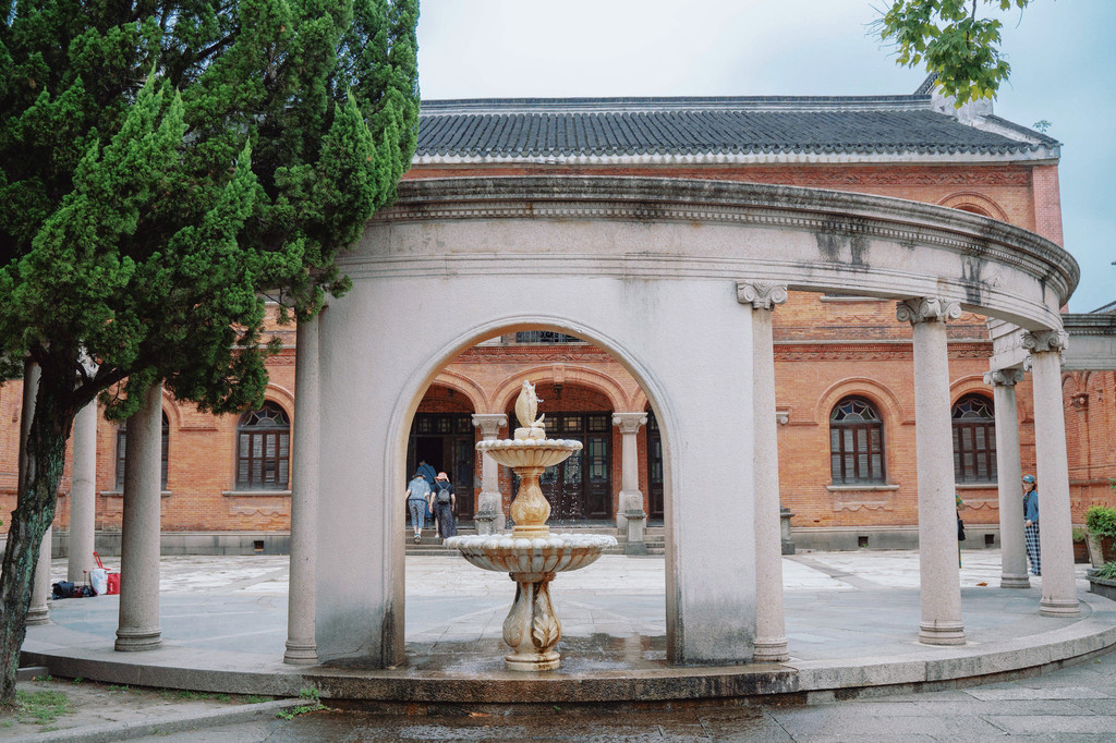 后院是西式建筑的舞厅,由四周高高的中式马头墙围起,可以看出来当时张家十分低调,财不外露。它的建造时间跟红房子差不多,但是精美程度更上一层。来自法国的罗马柱、铁栏杆、红砖、百叶窗构筑了法国巴洛克风格建筑。