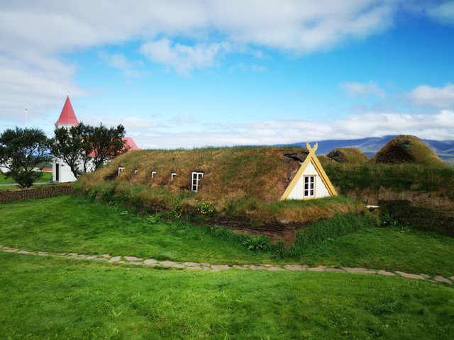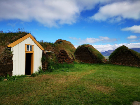 在上世纪之前,冰岛人为适应恶劣气候,居住在这种屋顶铺草的半地下草顶屋来抵御寒风。