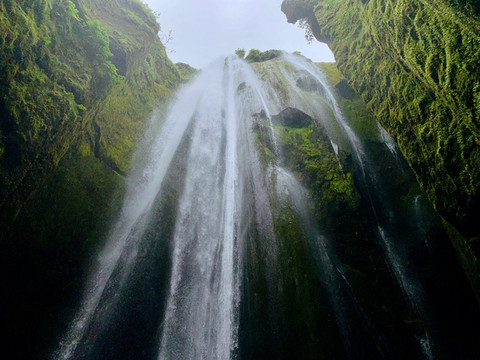 冰岛的高人气明片。游客可以沿着小径一直走到水帘后面,透过雾气欣赏柔美迷蒙如丝绸般的水帘。