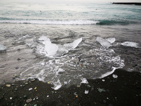 冰河湖的浮冰随着水流最终漂入广袤的大西洋。钻石黑沙滩上搁浅着大大小小晶莹剔透的碎冰,被海水冲刷打磨后如钻石般闪烁。海豹在附近的海面嬉戏。