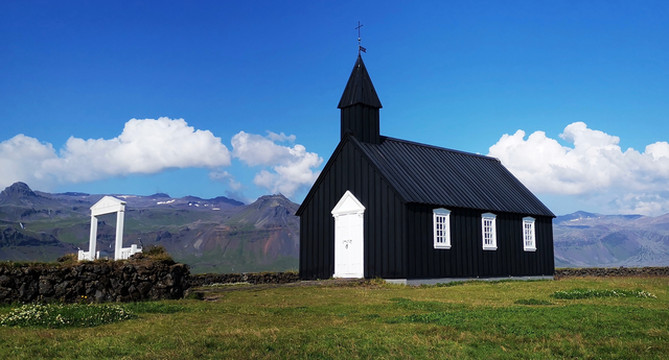 孤独矗立在大西洋边的纯黑教堂,与周围鬼斧神工的火山熔岩和远处的绵延冰川构成了绝美画面。