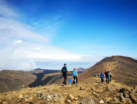 从停车场沿山谷步行3公里登上火山口对面山顶。蓝天下两公里开外的火山口里红色岩浆如炼钢炉里的钢水,熔岩四溢;飞溅的火花不断从隆起的火山口涌出,把周围如沥青般熔岩上又覆盖了一道道殷红。直升机在火山口上空盘旋,人们或坐或站,聆听远处的轰鸣, 感受地心之力的壮观与震撼。
