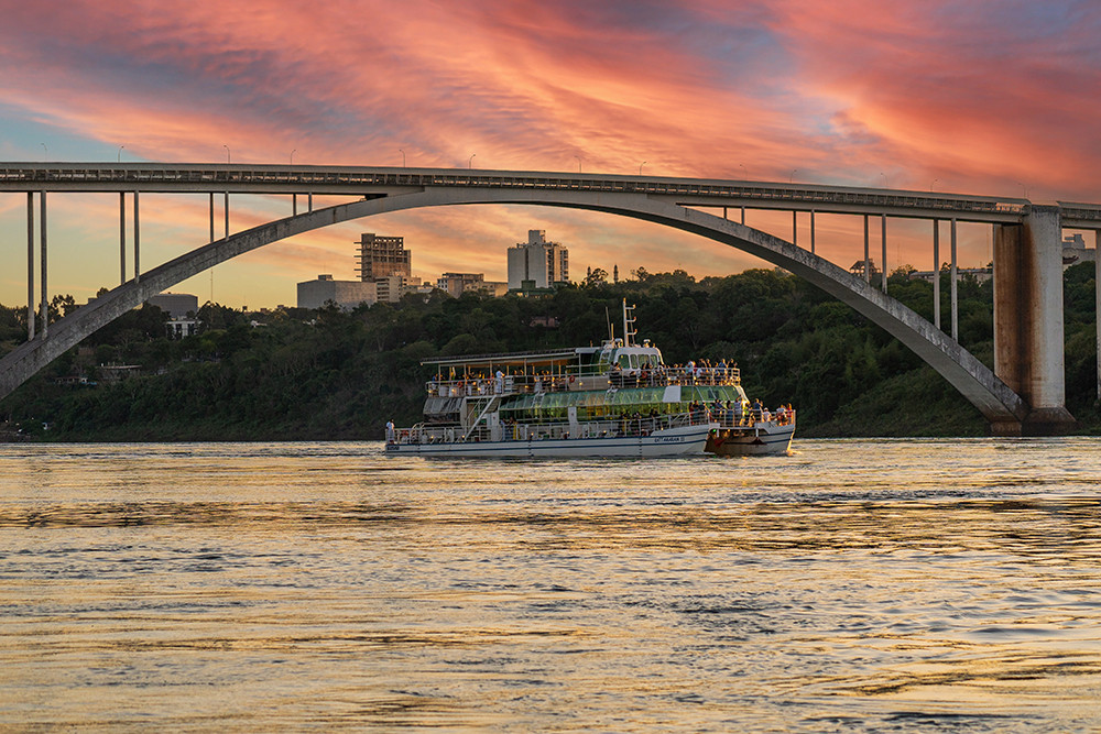 登上现代感十足的双体船,于伊瓜苏河与巴拉那河交汇处徐行,仰望连接三国边境的桥梁和沿岸夜景。晚风轻拂,灯火璀璨,自助晚餐香气扑鼻,恋人们可在甲板举杯观落日,也可在船头留下浪漫合影。