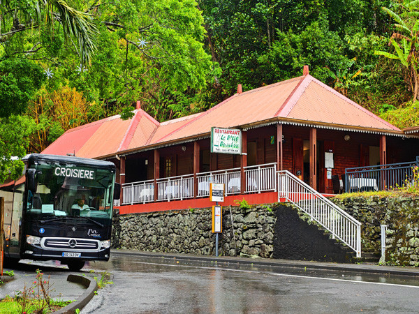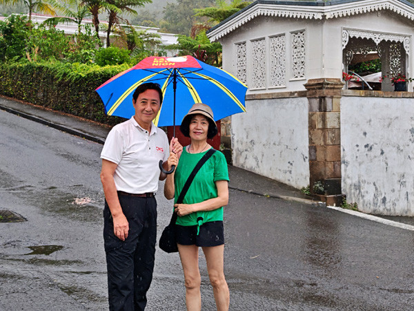 领队焦健带领大家下船,地陪导游刘依华已在码头外,热情地恭候大家的到来。团队乘大巴车前往留尼旺的首个著名景点:地狱堡小镇观光。谁知途中下起了大雨,但依然没有减退大家的热情。