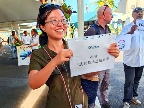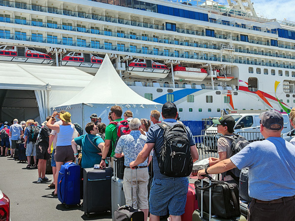 当日,在路易港码头上记者看到,来自世界各地四面八方的众多游客排着长长的队伍在巨大的邮轮下等候。虽然客流巨大,但是秩序井然。