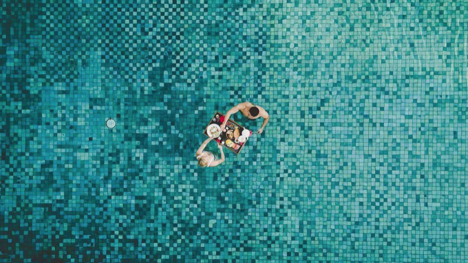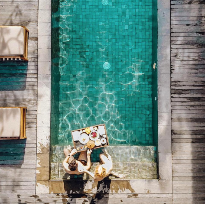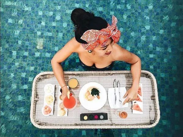 在这家酒店的漂浮早餐,特别适合空拍,因为泳池下方碧蓝的磁砖非常耀眼。