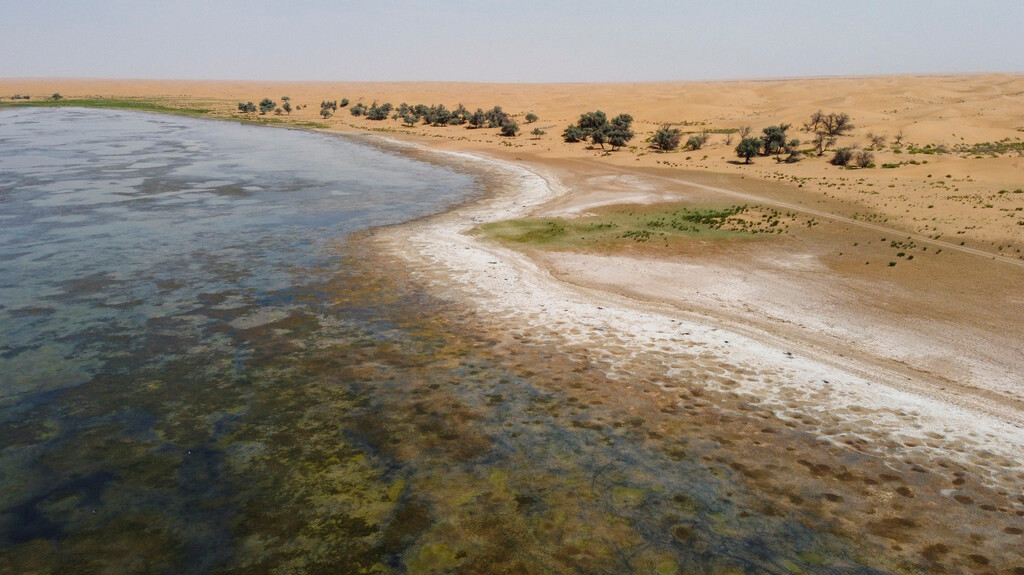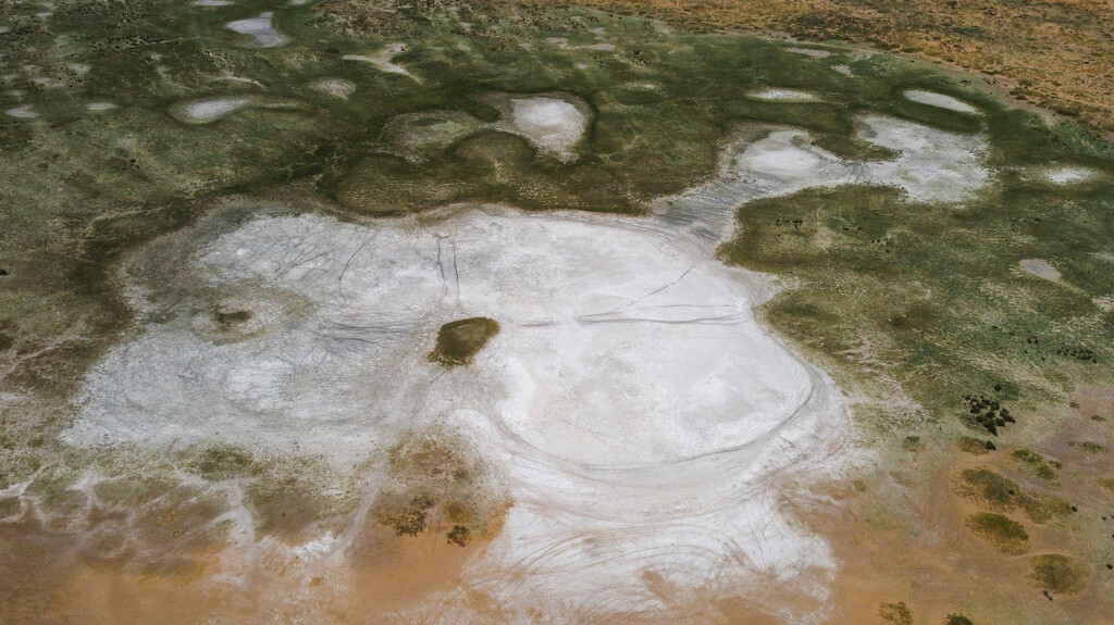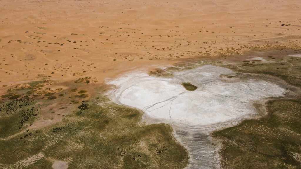 苏海图湖与乌兰湖相距大约16公里,由于蒸发量巨大,如今的苏海图湖已接近干涸,如果不是无人机俯瞰,几乎看不出湖的痕迹,只剩下白色的盐碱、稀松的绿植和一望无际的黄沙。