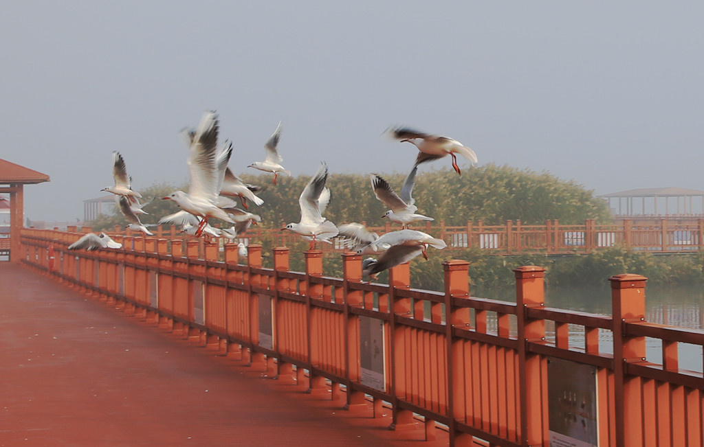 景区的购票大门在大雾中孤零零的显示着轮廓,周围只见守门的工作人员,象是才从梦境中醒来,无精打采。见有人来,才打起精神,说雾很快会散,等我们走到之后,一定是充满阳光的一个早晨。后来虽没有他那么说的夸张,但确实是还不错的晴空,碧波相映,众鸟啼鸣,苇丛如诗,野趣天成。