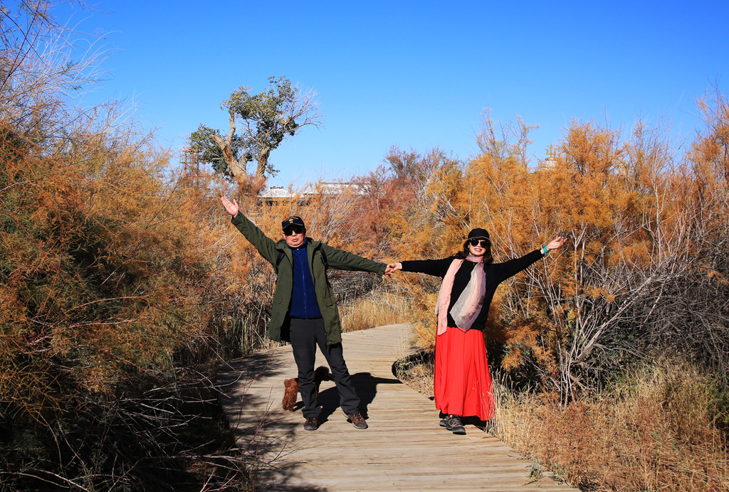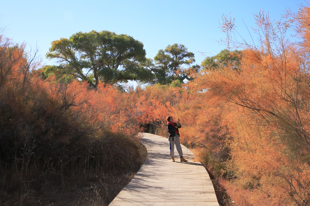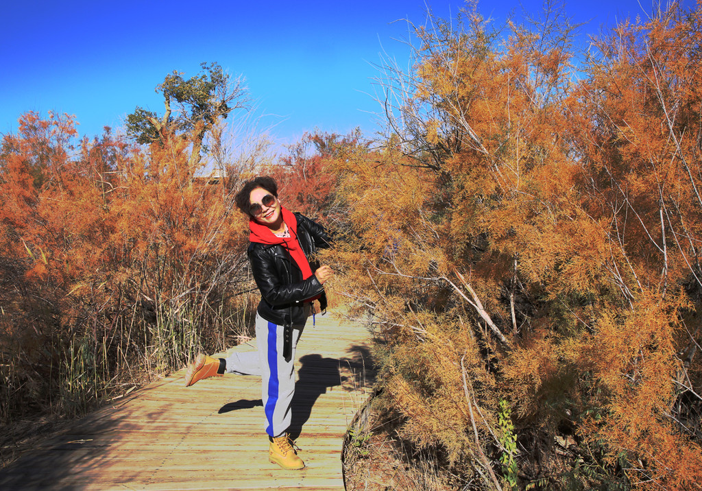 额济纳的786县道很有特点,二边高大红柳为这条路增添了亮色,还有弱水河的支流在一边缓慢的延伸,各种色彩的胡杨散落在河岸边,红柳丛林边人家,有一大片胡杨林,叶子还没到金黄的时候,但很能吸引人的眼帘,在南方一定是绝佳的度假之地,如果不是胡杨林的大力宣传,我们也不可能放过这样的景色,顺着河边慢悠悠的行走,更能解读额济纳的秋天。