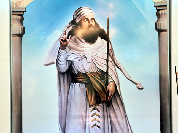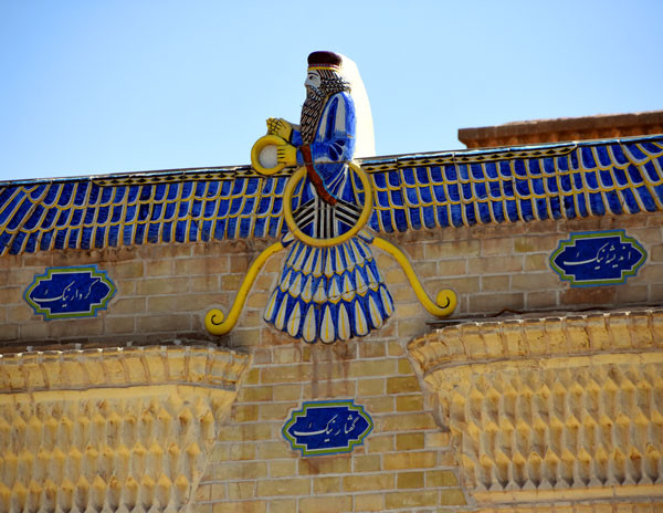 走进火神庙拜火教博物馆,映入人们眼帘的这座建筑正上方,就是十分醒目的蓝色拜火教的标识:法拉瓦哈(Faravahar)。我们在伊朗设拉子波斯波利斯古城遗址,就曾经看到过其浮雕的图形。它体现的是基本教义:真善美,契约精神,生死轮回,天堂地狱。