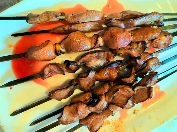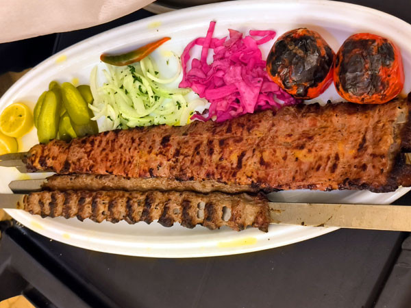 当日伊朗时间12:50,《探秘波斯帝国伊朗》团队,结束了康克古村落的寻访回返到马什哈德。中午在马什哈德哈什巴烤串餐馆,品尝了一顿十分丰盛的羊与鸡大串(羊腰、羊心、羊肝、羊肉,鸡翅)套餐。