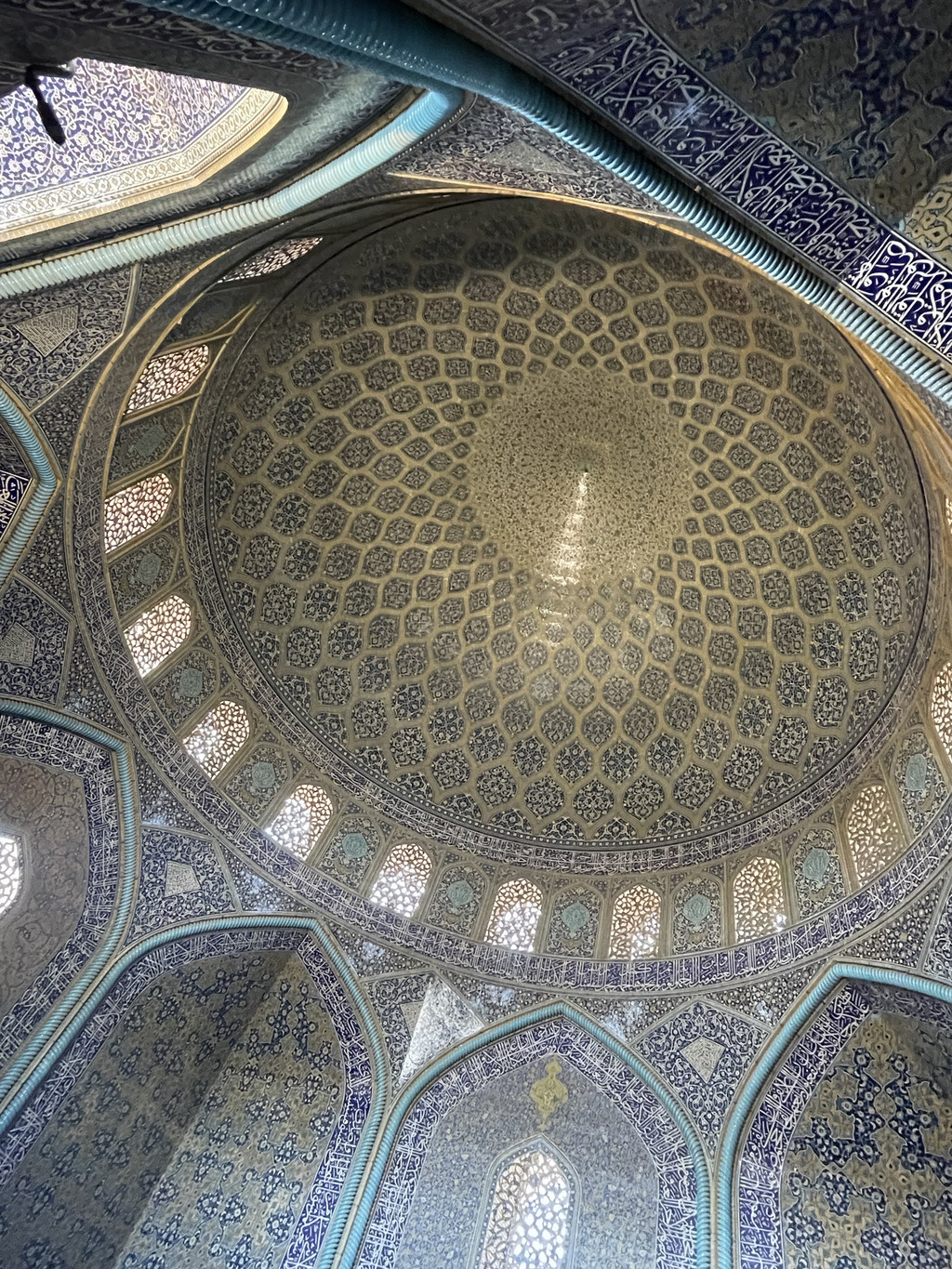 位于广场东侧的谢赫洛特芙拉清真寺是以阿巴斯大帝岳父(黎巴嫩著名什叶派学者)命名的,修建于1602年,完工于1619年,整整用了18年时间。该清真寺有两大特点,一是清真寺没有庭院和宣礼塔,据说原因是清真寺仅供皇室内部使用,所以不需要;二是清真寺穹顶外部的颜色会随着太阳光线变化,到傍晚会逐渐变成粉红色。