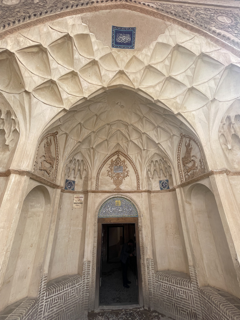 布鲁杰尔迪古宅,成于1876年,建造过程花费了18年时间。宅子虽然不象清真寺、皇宫那样闪亮耀眼,但用石膏板建造的房顶依然是花纹繁复,精致无比,能让人更好得体会线条构造之美。宅内主建筑喜欢采用繁复华丽的穹顶,穹顶正中呈圆形,有的以圆孔透光,四周再按几何规则呈花瓣状有层次地排布散开。从色彩搭配到图案设计,从几何结构到空间层次都堪称完美。