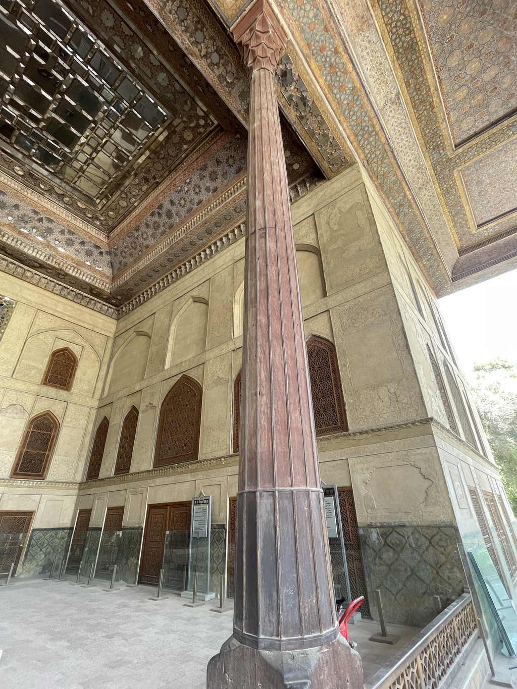 “四十柱宫”是伊斯法罕有名的建筑。这座宫殿位于一个占地67000平方米的大花园中。花园是阿巴斯大帝修建,而花园中央的宫殿则是其后的阿巴斯二世于1647年建造,专为接见和宴请外宾之用。宫殿的前面是一个巨大的门廊,门廊由20根柏木做的独木巨柱支撑。门廊前面有一个长110米、宽16米的水塘,水从安放在塘底的四头狮子的口中喷出。塘水清澈见底,波光粼粼。木柱倒映在水中,又有20根同样的柱子浮现。人们根据这一独特的景观将宫殿称为“四十柱宫”。这一实一虚,人间水底,两重世界,催人遐思。